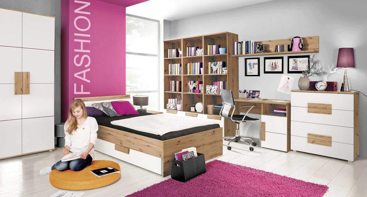 Die Beschichtung in Artisan Eiche, wirkt sanft und beruhigend. Das Set Arkina ist so etwas wie ein Babysitter für Große. Auf dem Bett lagert es sich gut, die Nachtkommode verbirgt Süßes und Saures, und Schrank und Kommode sind die nützlichen Helfer beim Ordnung Halten. Nicht zu Vergessen sind natürlich gleich 3 Regale. Ein Schreibtisch ist das, was schon sehr erwachsen wirkt. Zack, werden in diesem Zimmer aus kleinen Prinzessinnen und Prinzen große Mädchen und Jungen.