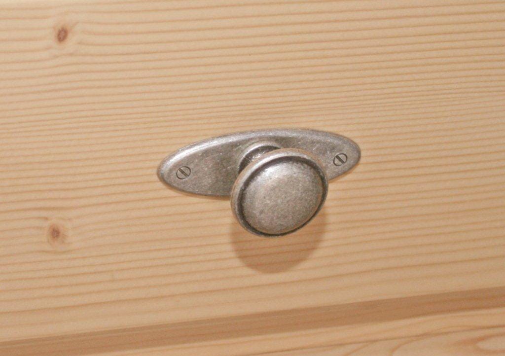 Die Anrichte Kiens ist aus massiver Fichte gefertigt. Hinter den verschließbaren Türen befindet sich 1 verstellbarer Holz-Einlegeboden. Die Schubkästen sind klassisch geführt, OHNE Metall-Auszug. Beide Türen haben gefräste Holzfüllungen. Des Weiteren bieten die 2 Schubladen für ausreichend Stauraum. Alle Beschläge sind aus antik gearbeiteten Eisen.