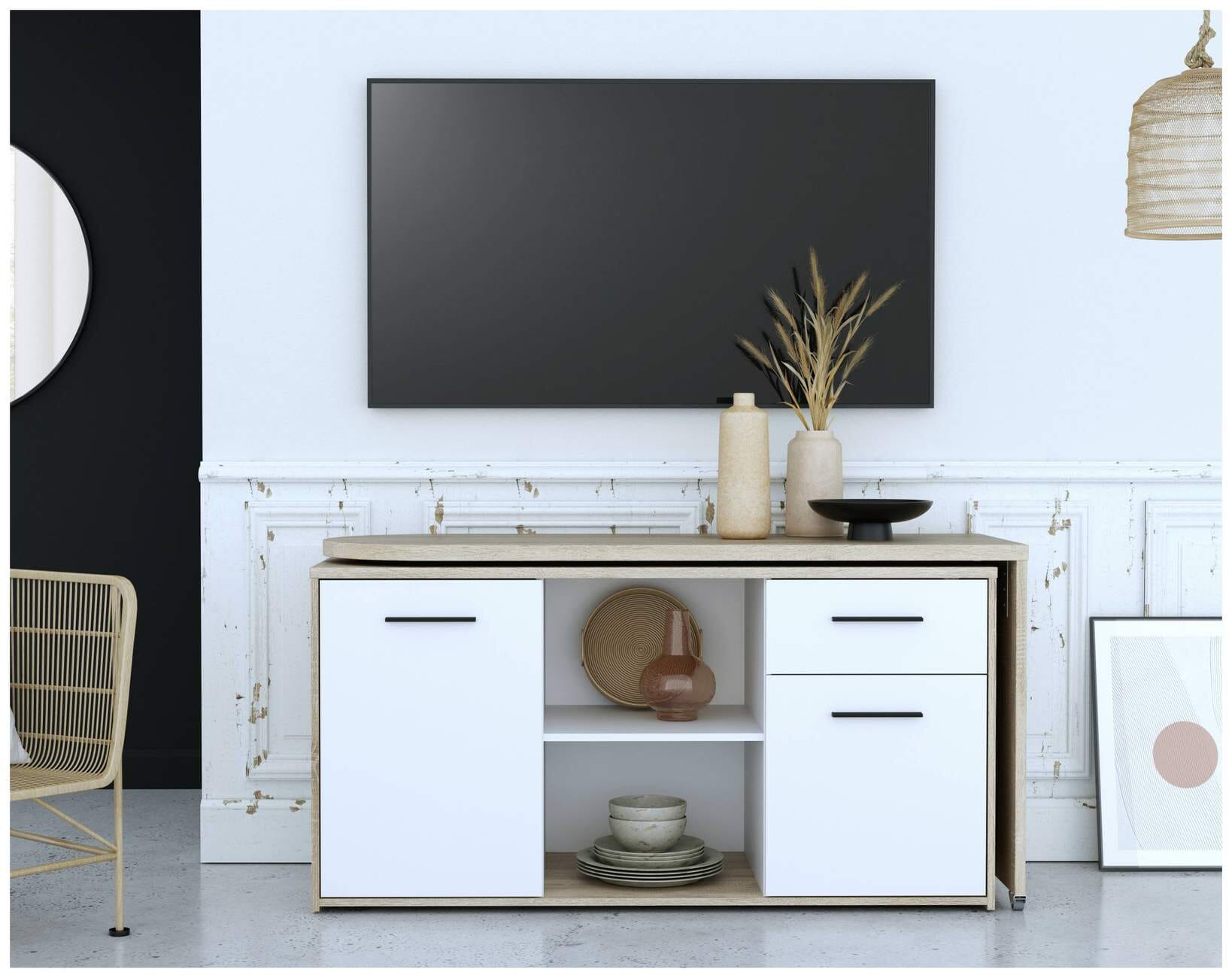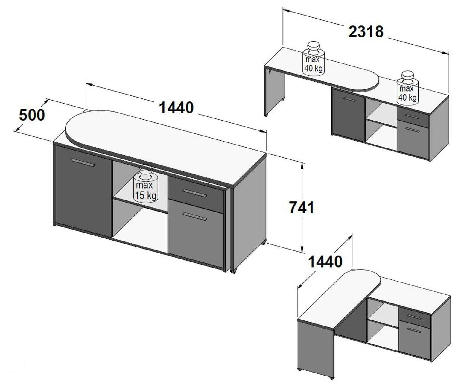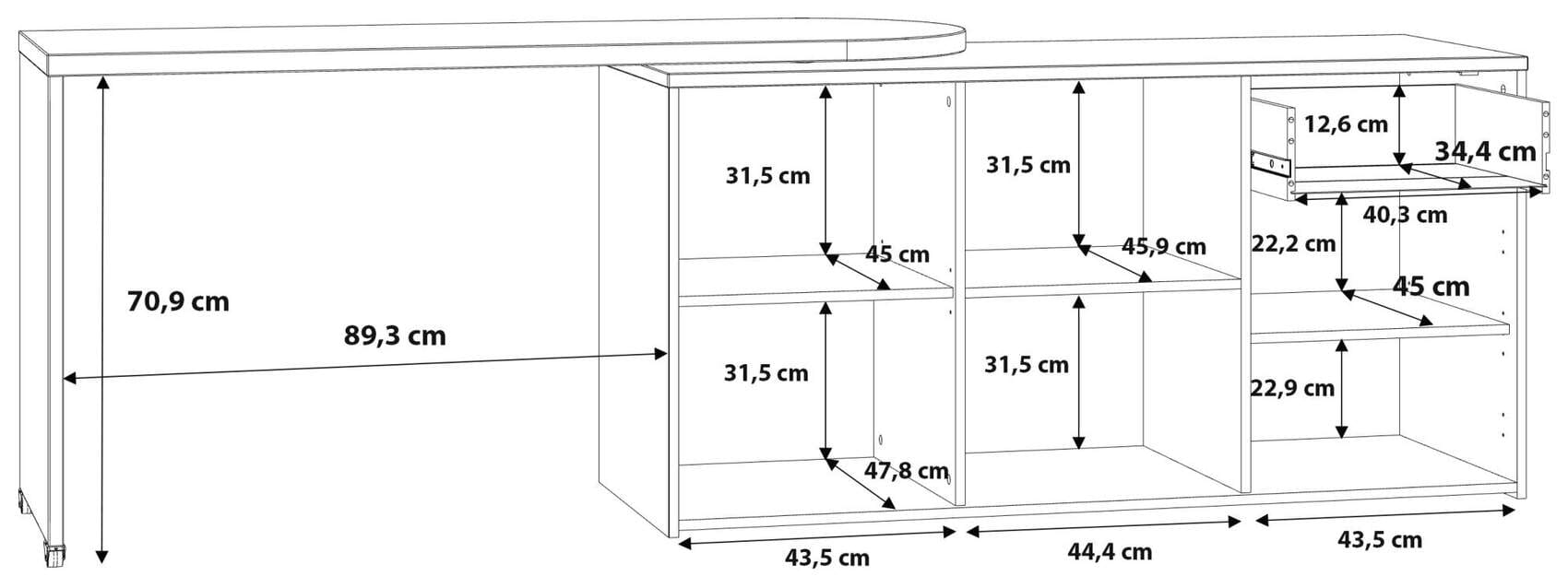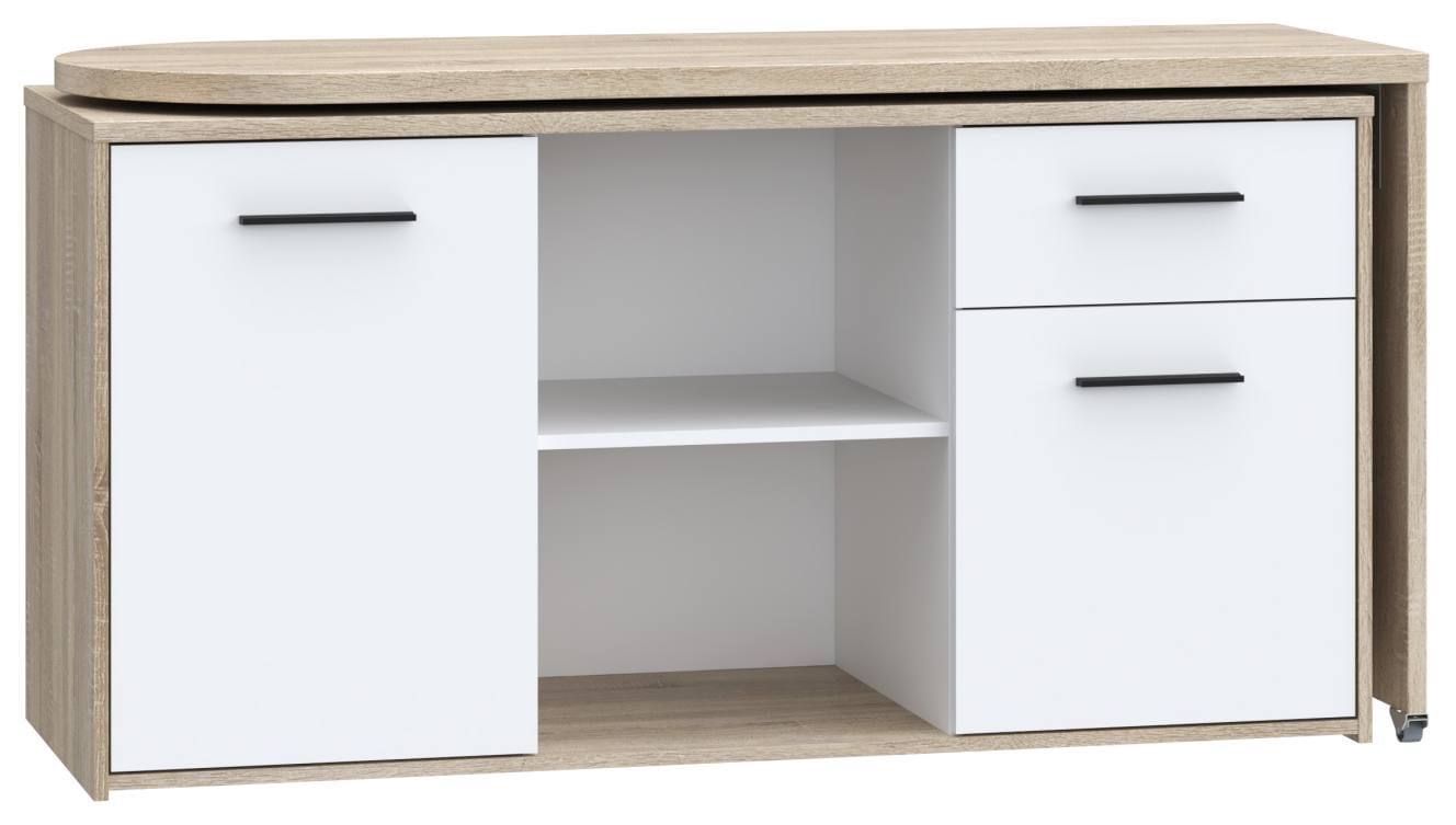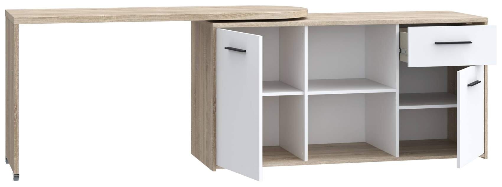 Aus einem Sideboard wird ein Schreibtisch, der um die Ecke geht. Und "ratzFatz" verwandelt sich der Eckschreibtisch in einen Arbeitstisch mit viel Platz für Ihre Beine. Nicht zu vergessen wäre, dass die Basis noch immer ein praktisches Sideboard ist.