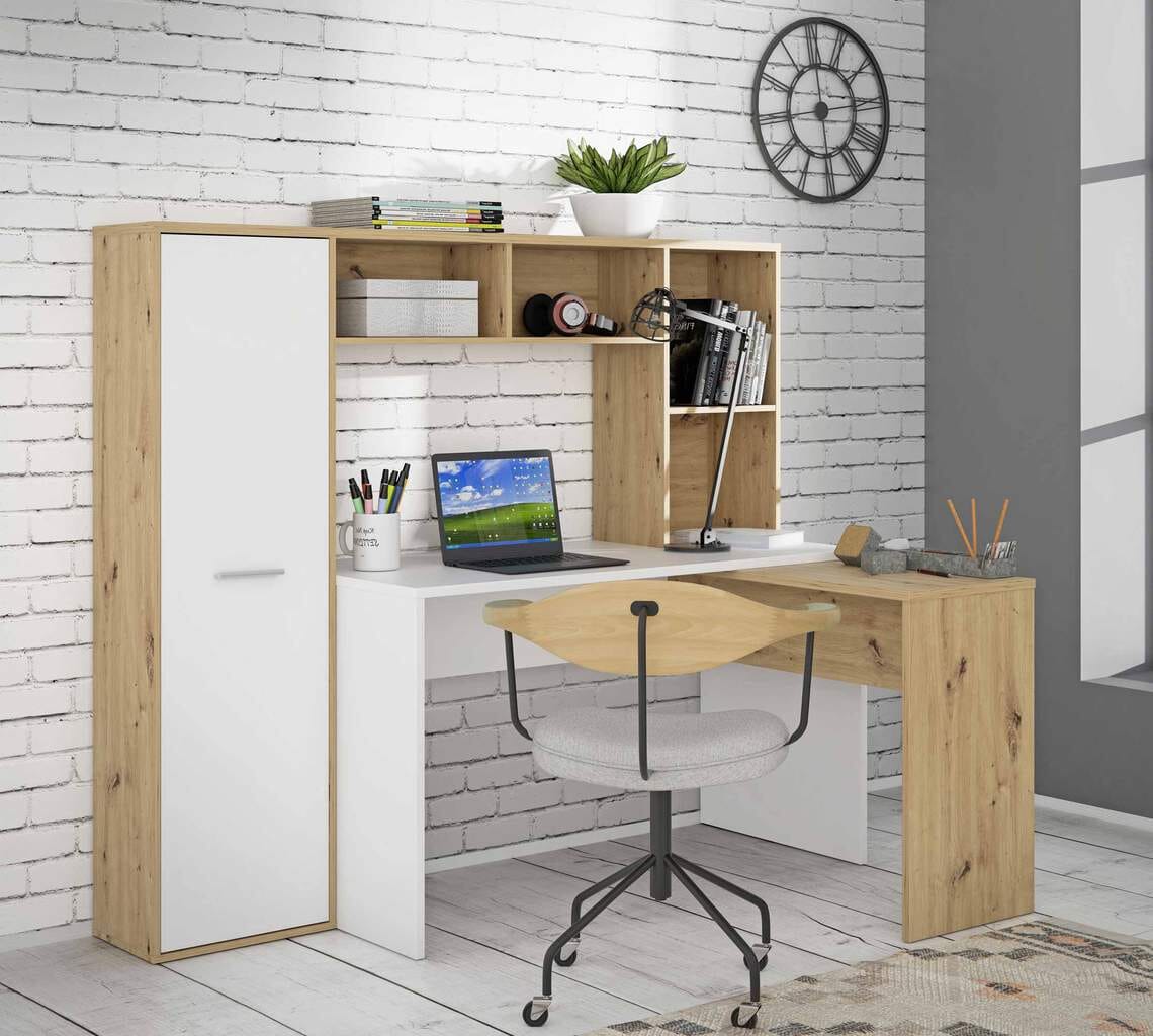Aufgesetzte Fächer in naturnaher Eichenoptik vermitteln nicht nur Wohnlichkeit in Ihrem Büro, sondern ermöglichen es Ihnen, Ihre Schreibutensilien immer griffbereit zu haben. Erweitert wird dieser praktische Stauraum um einen grazilen Schrank, hinter dessen Tür sich vier Einlegeböden verbergen.