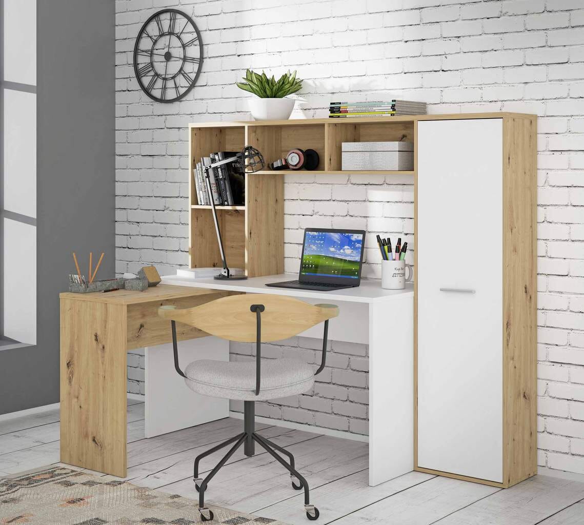 Viel Stauraum und die harmonische Kombination aus klarem Weiß mit warmer Artisan Eichen-Optik ist das Geheimnis des Arbeitstisches ERIADOS von Forte. Dieser klar strukturierte Schreibtisch heißt Sie dezent willkommen und lässt Sie fokussiert arbeiten. Ein über Eck verlaufender Arbeitsbereich ermöglicht es Ihnen, gleichzeitig den PC zu nutzen und Dokumente zu bearbeiten. Dabei unterstützt die abgesetzte Farbgebung des Möbelstücks mühelos Ihre Arbeitsstruktur.