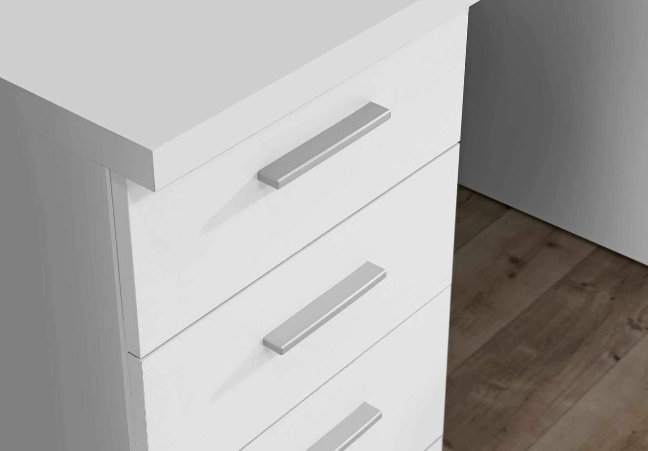 Silberfarbene Kunststoffgriffe an den Fächern lockern die glatte Optik dieses Schreibtischs auf und sorgen zusammen mit belastbaren Metallbeschlägen an Schubladen und Tür für eine komfortable Bedienbarkeit.