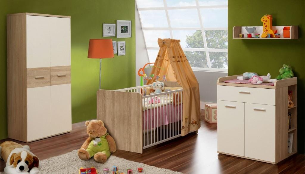 Und das erwartet Sie: ein Babybett für süße Träume, ein geräumiger Kleiderschrank, ein Wandregal als Teddyheimat, die Kommode für dies und das, ein Wickelaufsatz und ein Wandboard. Wenn Sie sich das betrachten, werden Sie zustimmen müssen, dass Ihrem Kind hier alles geboten wird, was es in seiner Nähe braucht. Und für Sie werden die ersten Monate mit Ihrem Kind zum besonderen Vergnügen!