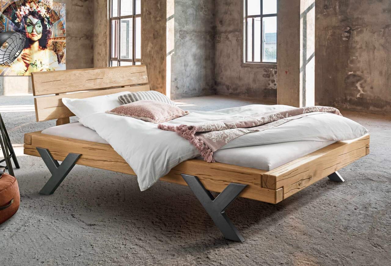 Balkenbett GORM mit Y-Fuß Massivholzbett Wildeiche geölte Oberfläche