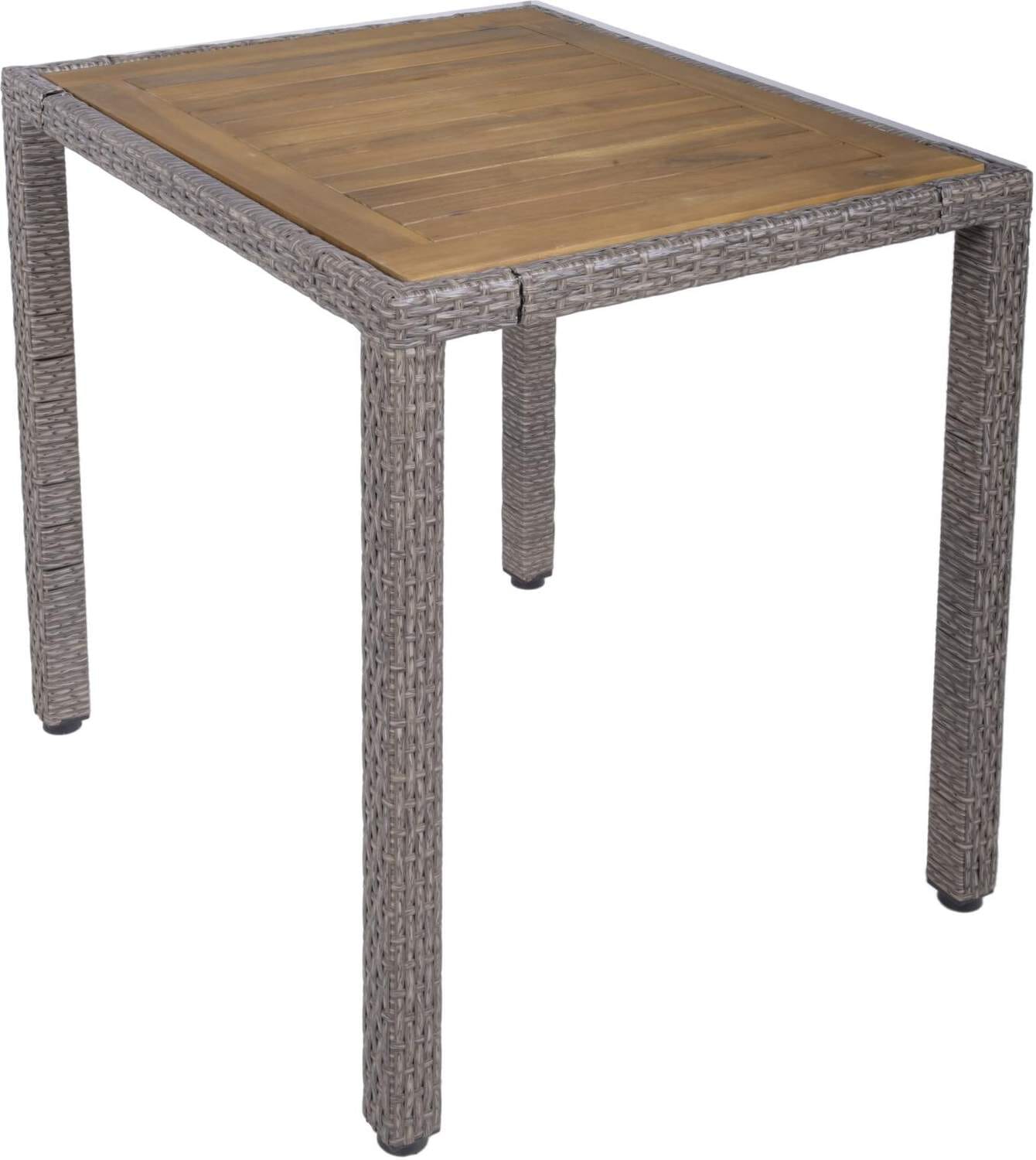Der Tisch verfügt über eine Platte aus Akazienholz, das für seine Witterungsbeständigkeit bekannt ist. Die Platte ist glatt und hat eine natürliche Holzmaserung, die für ein warmes und gemütliches Ambiente sorgt. Der Tisch hat ausreichend Platz, um Getränke, Snacks oder andere Gegenstände zu platzieren und ist stabil genug, um auch größere Gegenstände zu tragen.