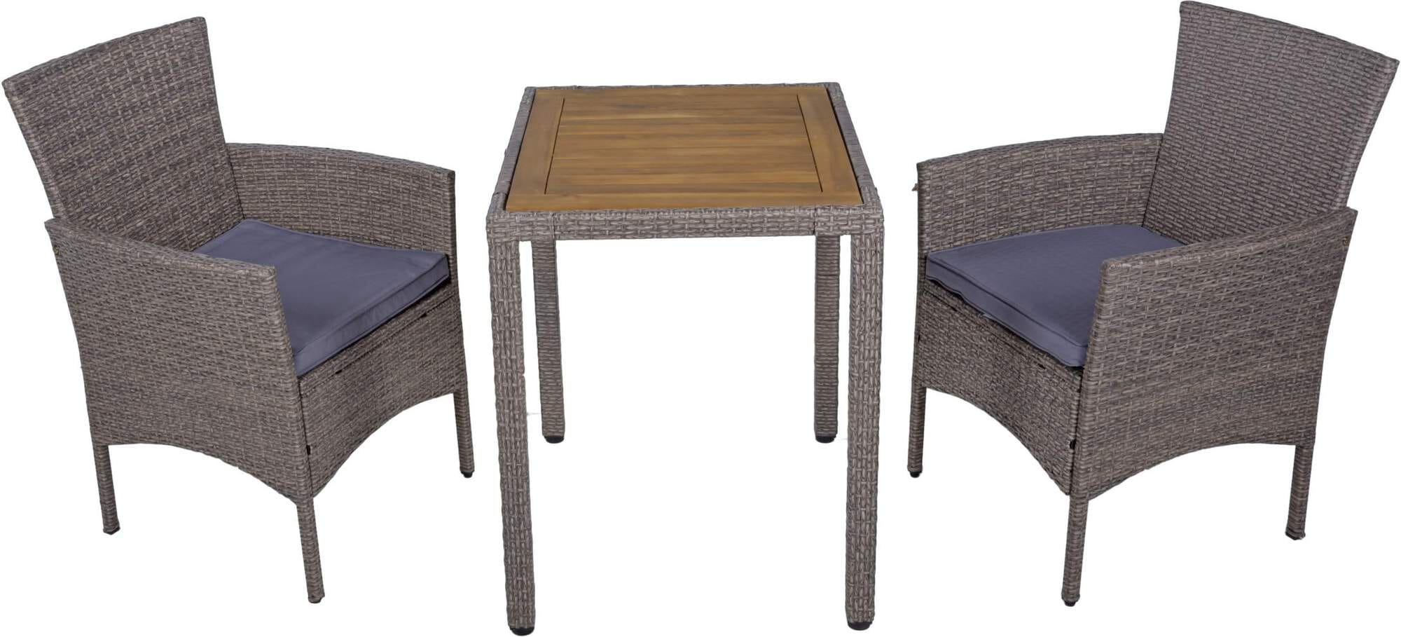 Ein dreiteiliges Balkonmöbelset bestehend aus zwei Sesseln aus grauem Kunststoffgeflecht und einem Tisch mit einer Platte aus Akazienholz