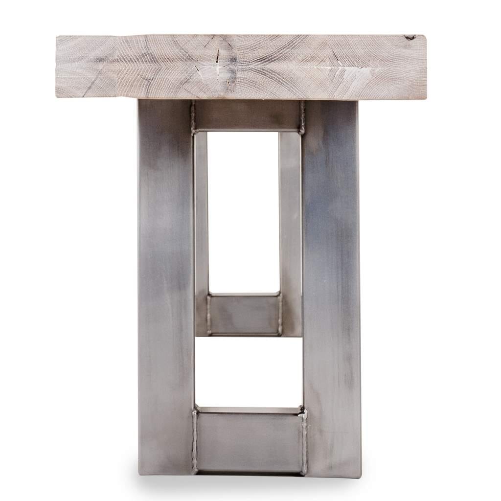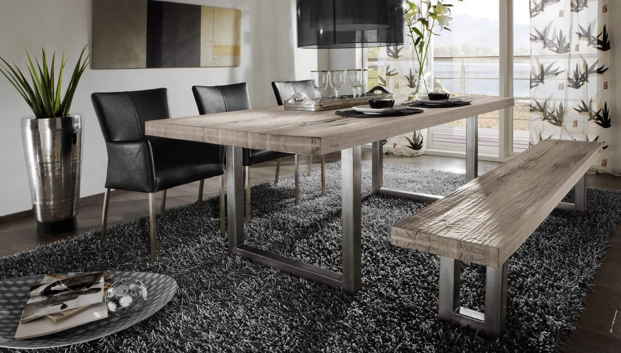Die Tischbank New York, passend zum Esstisch, ist die gelungene Kombination aus massiver Balkeneiche und rohem Eisen.