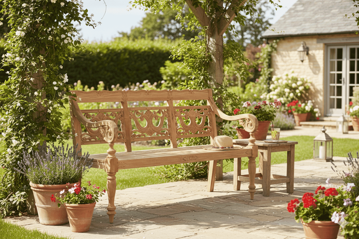 Genießen Sie Ihren Feierabend auf einer romantisch verspielten Bank. Die massive Teakholzbank ist reichlich verziert. Mit gedrechselten Füßen und vielen Schnitzereien, steht die Gartenbank immer im Mittelpunkt. Im Vorgarten, auf der Terrasse oder im Wintergarten, vermittelt die rustikale Sitzbank Gemütlichkeit und bringt südländisches Flair in Ihre Grüne Oase.
