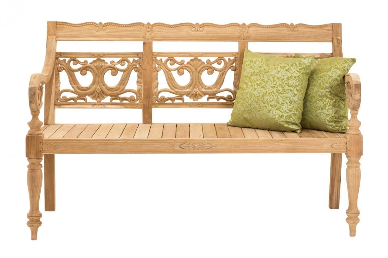 Wie in eine andere Zeit versetzt werden Sie sich fühlen, nur durch einfaches Platz Nehmen auf der Bank Teakbank INTAGLIO 150. Diese Bank ruft ein Wohlbehagen auf, das sich auf Sie und Ihre Gäste überträgt. Es sind vor allen Dingen die Verzierungen, die diesen Hauch von Nostalgia aufrufen. Die geschnitzte Rückenlehne ruft sicher viele "Ohs" und "Ahs" auf.
