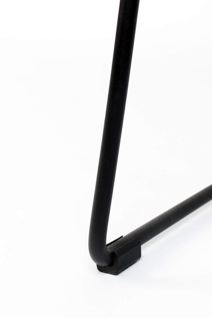Praktisch soll solch ein Möbel aber auch sein, nicht nur schön. So wurde eine Fußablage in passender Höhe angebracht, die ein lässiges Sitzen erlaubt. Gehalten wird das Ganze von einem schwarzen Pulverbeschichteten Stahlrahmen, der fragil wirkt, es aber nicht ist. Abgerundet wird der Hocker durch die Kunststofffüße, die den Boden schonen. Bravo!