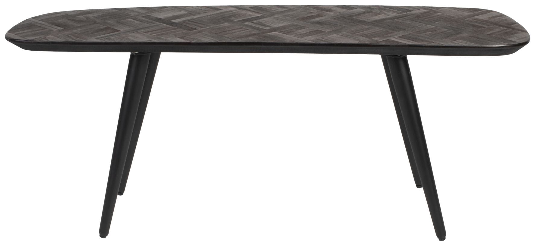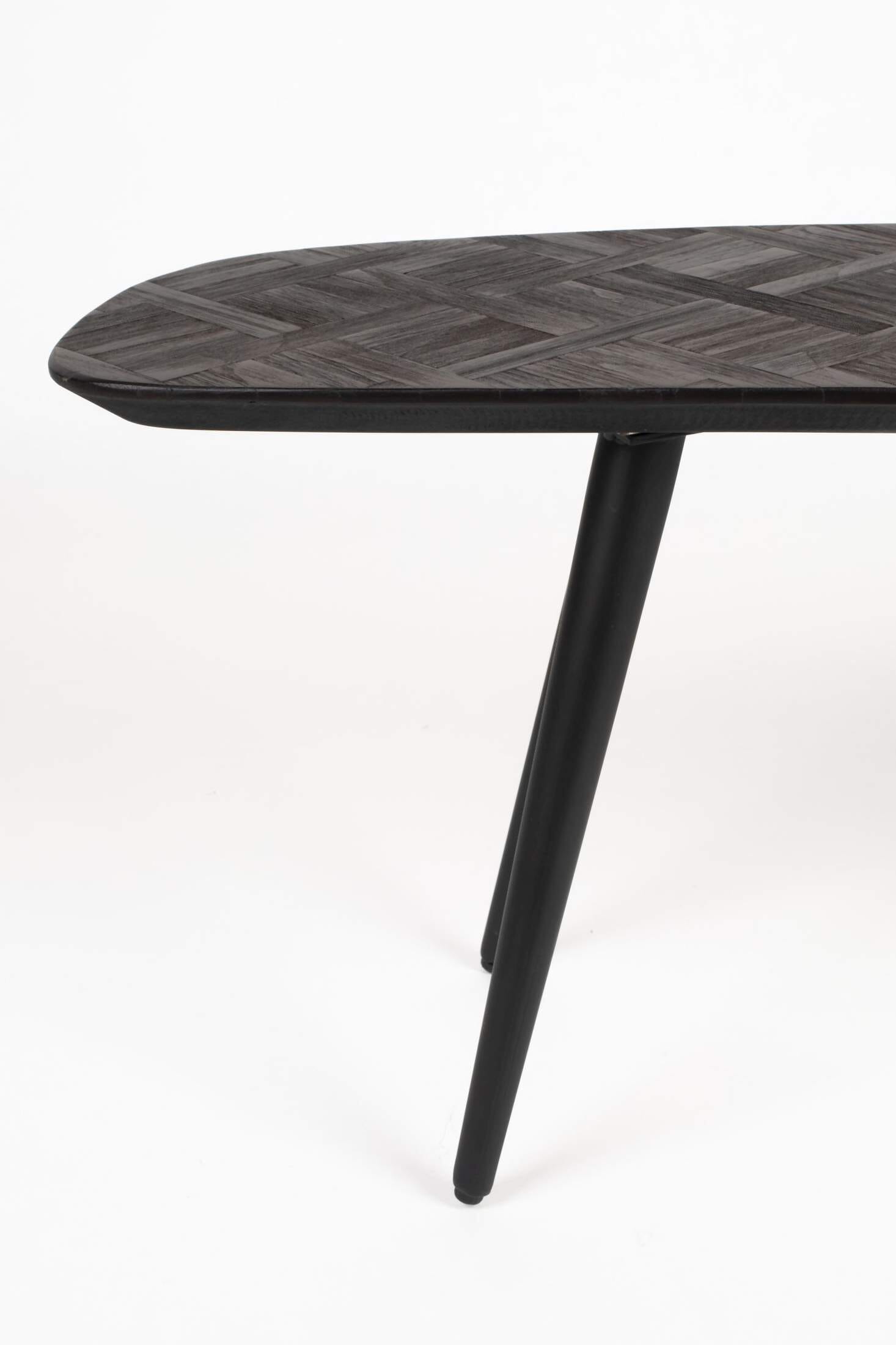 Dank seiner dunkelbraunen Tischplatte aus recyceltem Teakholzfurnier und Beinen aus schwarzem Eisen ist er ein einzigartiges und ansprechendes Design-Statement in Ihrem Wohnzimmer.