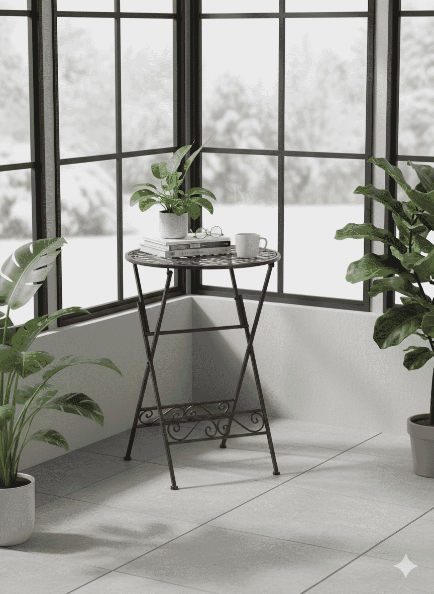 Das ist nicht alles, wenn auch der praktischste Aspekt. Der Beistelltisch Klapptisch APIA ist nämlich auch ein Eye-Catcher; er wirkt anmutig trotz seiner metallenen Statur und bringt schwups einen Hauch vom sonnigen Süden in Ihr Heim. Schmiedeeisen ist das Material der Wahl, das antik braun veredelt wurde. Casa Verona, va bene, der Name des Herstellers deutet einiges an. Der Tisch kommt komplett montiert zu Ihnen. Hier mit den Zitronen oder einer Oleanderpflanze oder Croissants und Kaffee? Ihre Wahl!