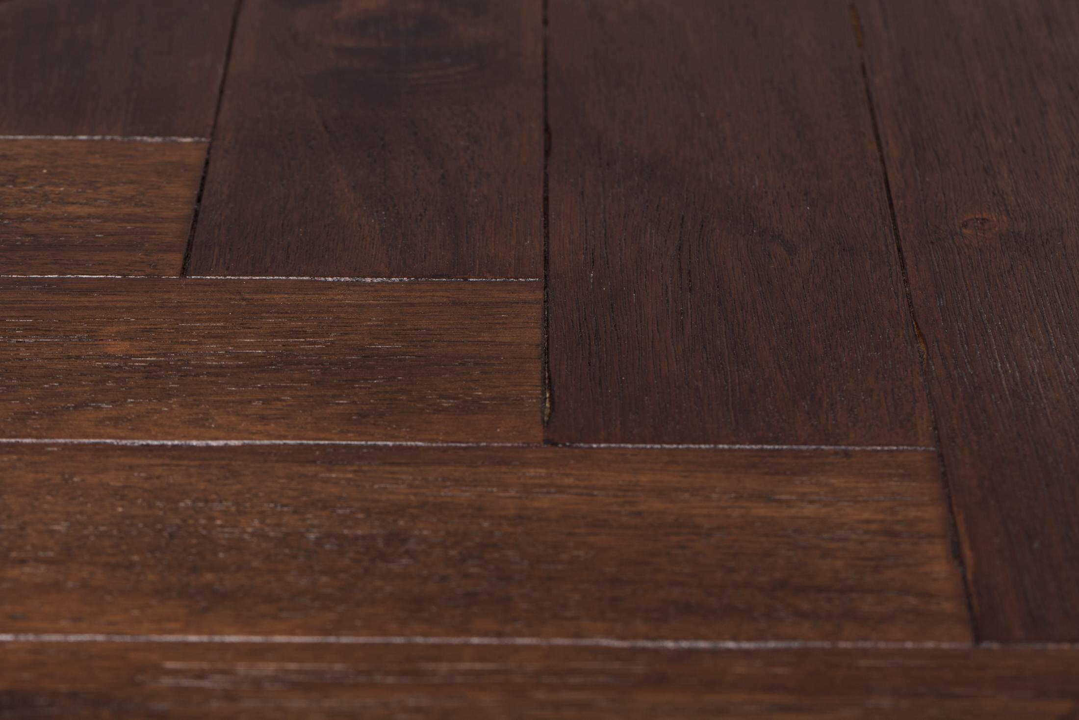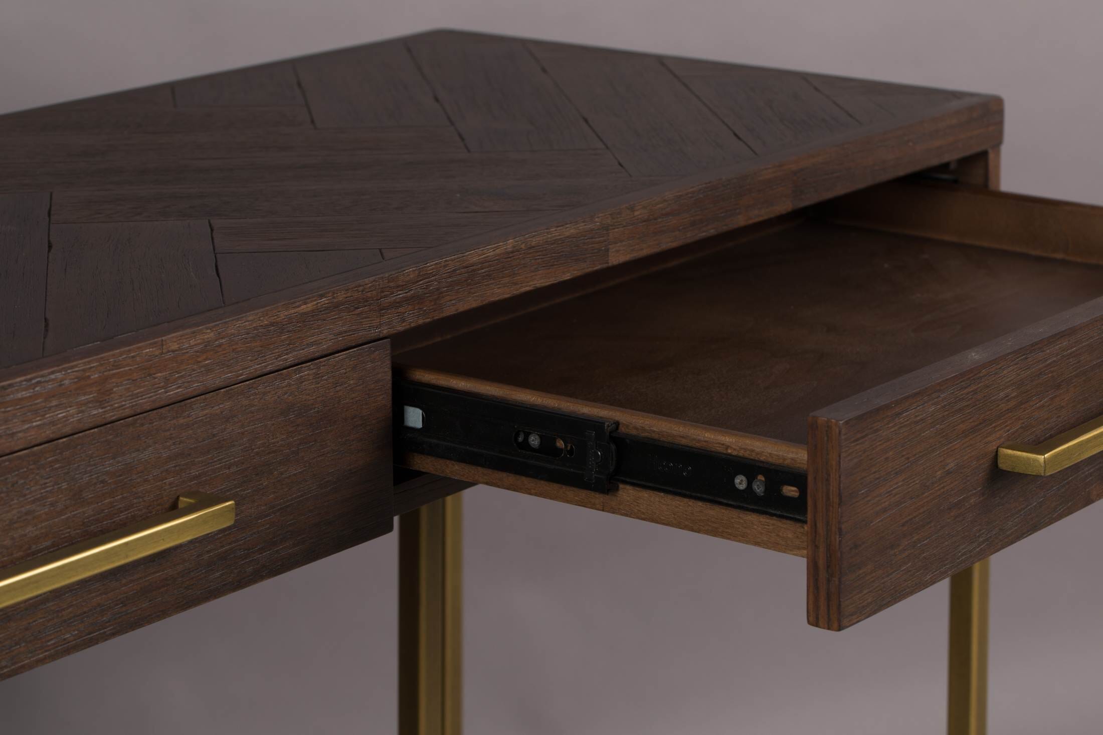 Das Akazienfurnier passt mit ihrer dunklen Farbe perfekt zu dem Gold und lässt alles sehr elegant wirken. Die Reelinggriffe der beiden Schubladen in dem Tisch greifen das Metall der Füße wieder auf und ergeben ein stimmungsvolles Bild. Sie lenken den Blick auf das herrliche und aufwendige Fischgrätmuster der Tischplatte.