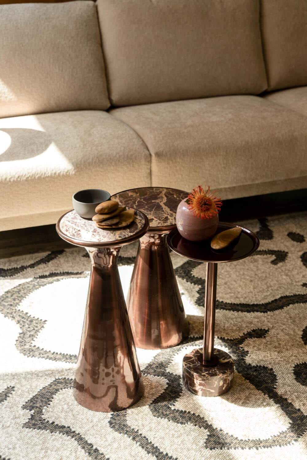 Lassen Sie sich von dem Beistelltisch MOUNT S aus recyceltem Aluminium mit Marmorplatte begeistern und setzen Sie ein stilvolles Statement in Ihrem Zuhause!