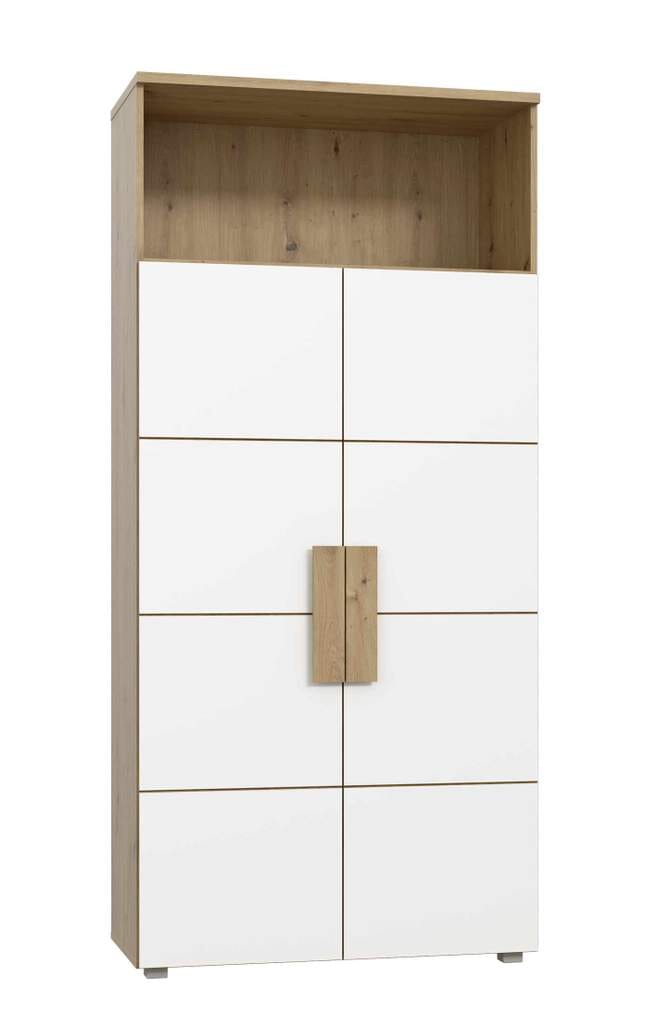 Die Farbkombination ist aber auch pfiffig und gleichermaßen frisch. Naturnahe Artisan Eiche und strahlendes Weiß - daraus entsteht ein Möbelstück, das nicht nur ein geräumiges Innenleben hat, sondern auch für sich gesehen einen Gewinn darstellt. Spanplatte und MDF, mit einer rubusten Beschichtung versehen, stellen hier die stabile Grundlage dar. Auffällige Möbel-Griffe runden ein Möbelstück ab, das Sie, egal wo Sie es einsetzen, bezaubern wird.
