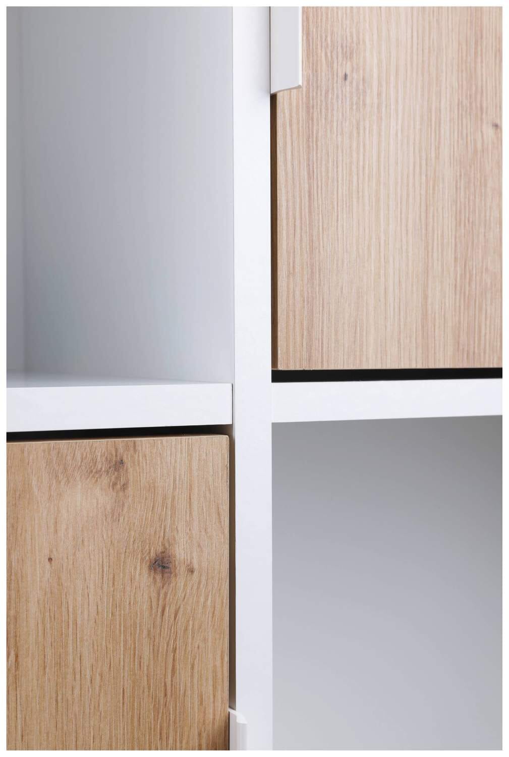 Die clevere farbliche Aufteilung aus dunkel und hell sorgt noch für das Plus an Spannung. Mit dieser gefälligen Farbkombination aus weissem Korpus und fünf praktischen Türen in angesagter Artisan Eiche haben Sie einen mordernen Hingucker im Wohnzimmer. Natürlich funktioniert dieses Möbelstück auch im Kinderzimmer oder im Homeoffice. Das kleine Plus: Die Türen sind je nach dem, welchen Platz man schließen möchte, variabel montierbar!