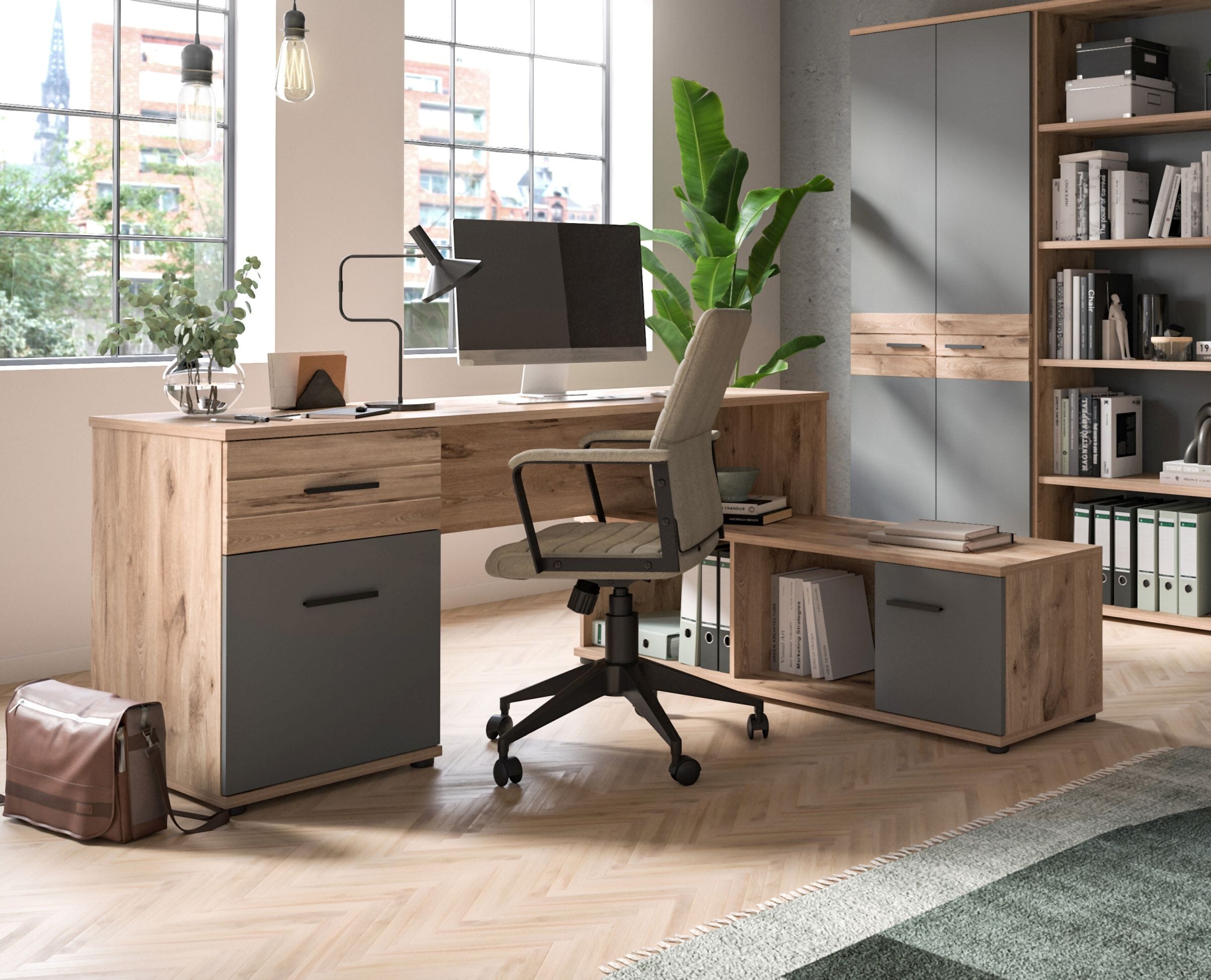 Die Kombination aus der warmen Holzoptik in Nox Eiche und dem zeitlosen Basalt grau passt perfekt in jeden Raum. Die verschiedenen Stauräume bieten ausreichend Platz für Ihre Akten, Bücher und Arbeitsmaterialien.