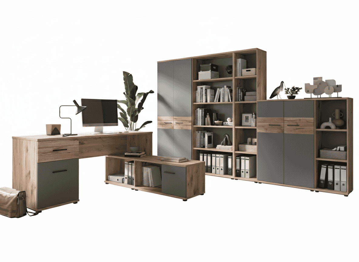 Das Büromöbel-Set MASON ist die ideale Lösung für ein gut organisiertes Büro. Mit dem Winkelschreibtisch, Büroschrank und den Büroregalen erhalten Sie ein Set, das optimal auf Ihre Bedürfnisse abgestimmt ist.