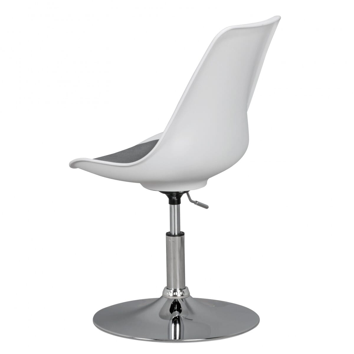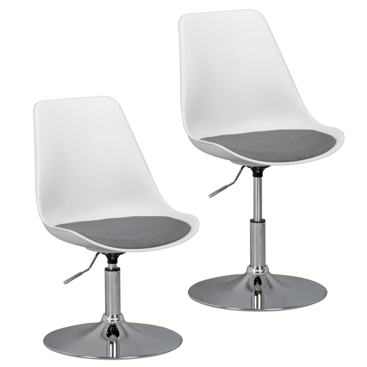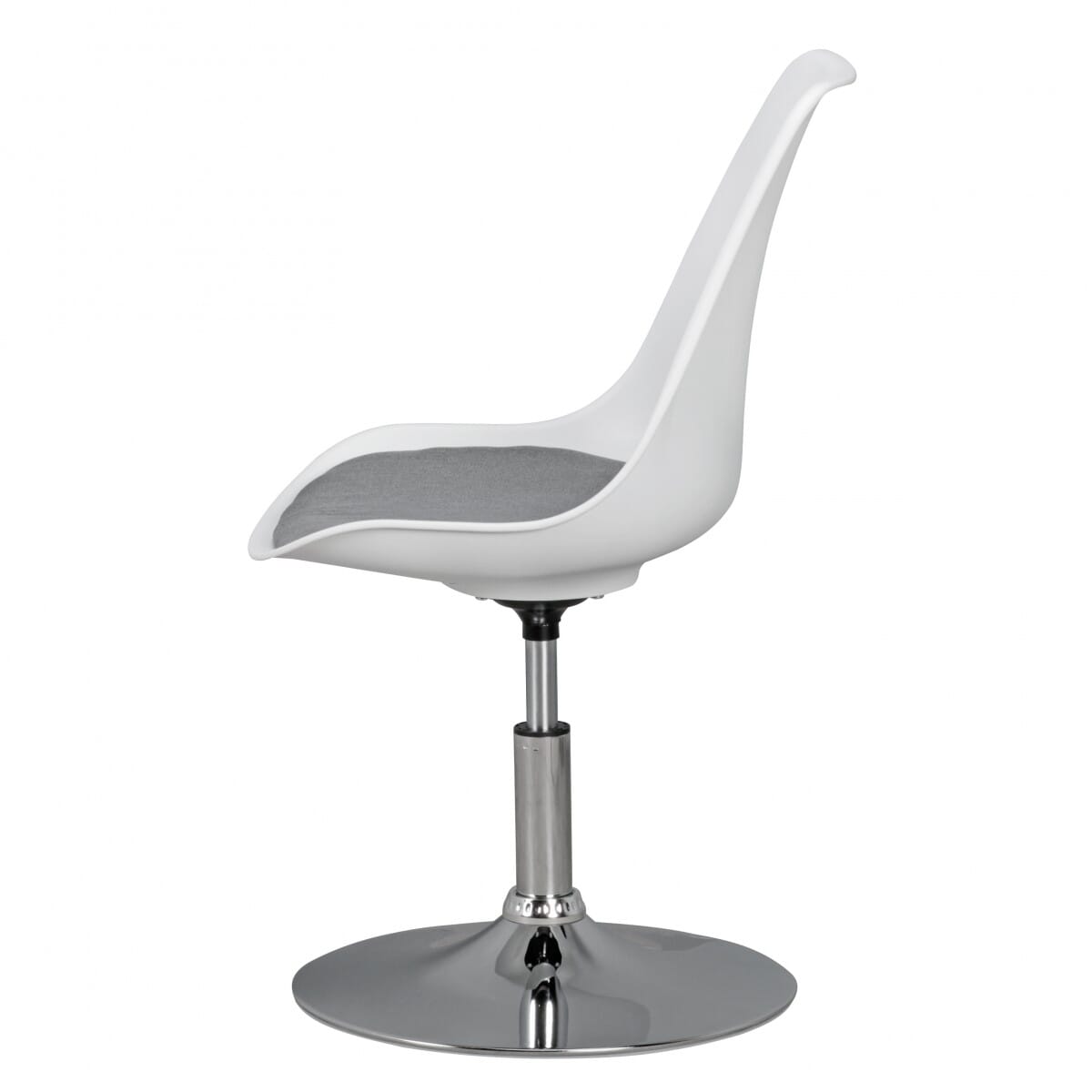 Der Drehstuhl bietet nicht nur eine bequeme Sitzfläche aus Stoff, sondern auch ein stabiles Gestell aus verchromtem Metall. Die Sitzfläche in Grau und die Sitzschale in Weiß verleihen ihm ein modernes Aussehen, das sich perfekt in jede Einrichtung einfügt.