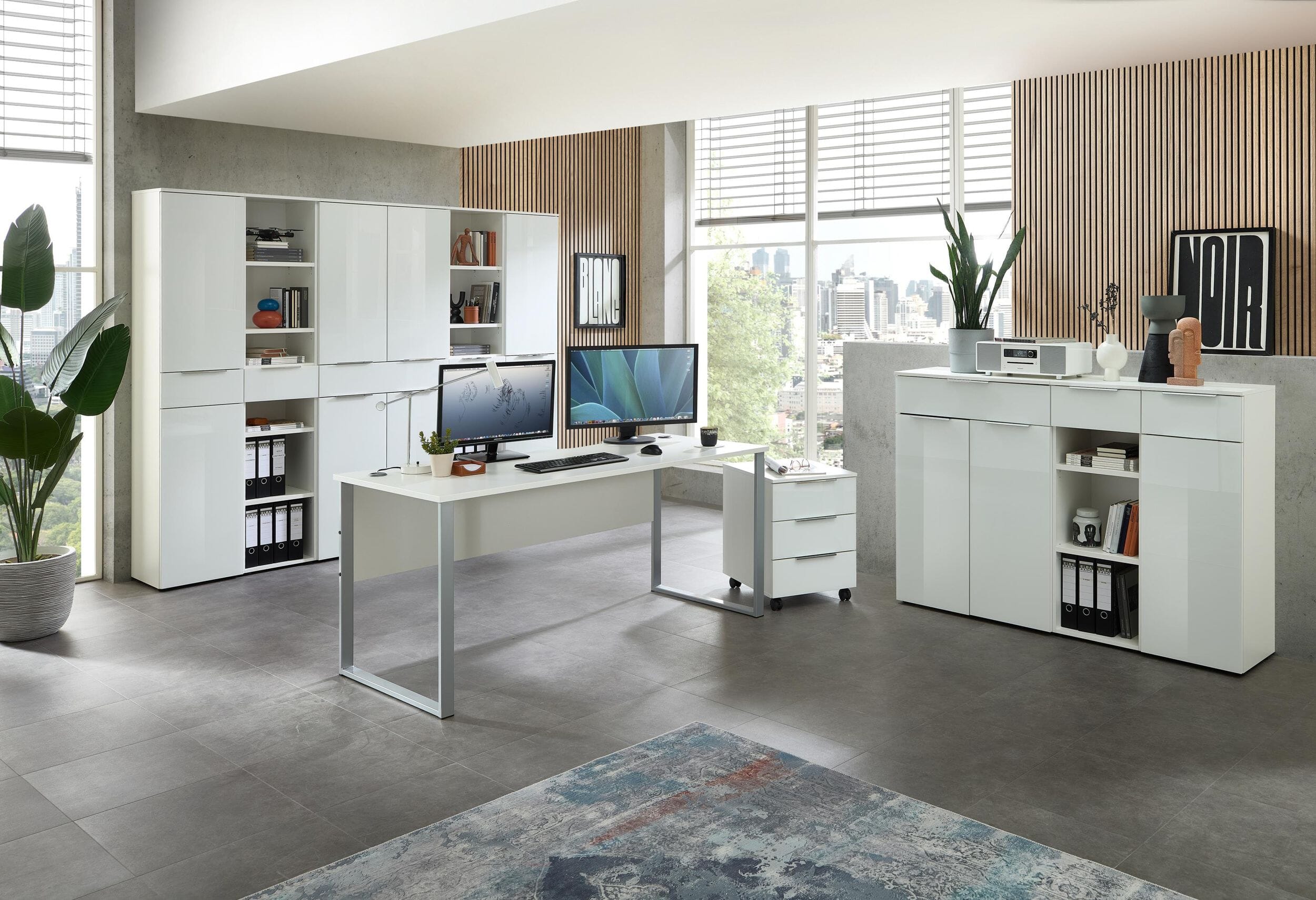 Erschaffen Sie sich ein Arbeitsumfeld, das Professionalität und moderne Eleganz ausstrahlt. Das 10-teilige Büro-Komplettset der Serie Santorin III bietet Ihnen eine perfekt abgestimmte Gesamtlösung für Ihr Home-Office oder gewerbliche Büroräume. Die Kombination aus zeitlosem Weiß und den luxuriösen weißen Glasfronten sorgt für ein helles, einladendes Ambiente. Mit diesem Set erhalten Sie eine großzügige Arbeitsfläche und ein durchdachtes Stauraum-System, das keine Wünsche offen lässt.