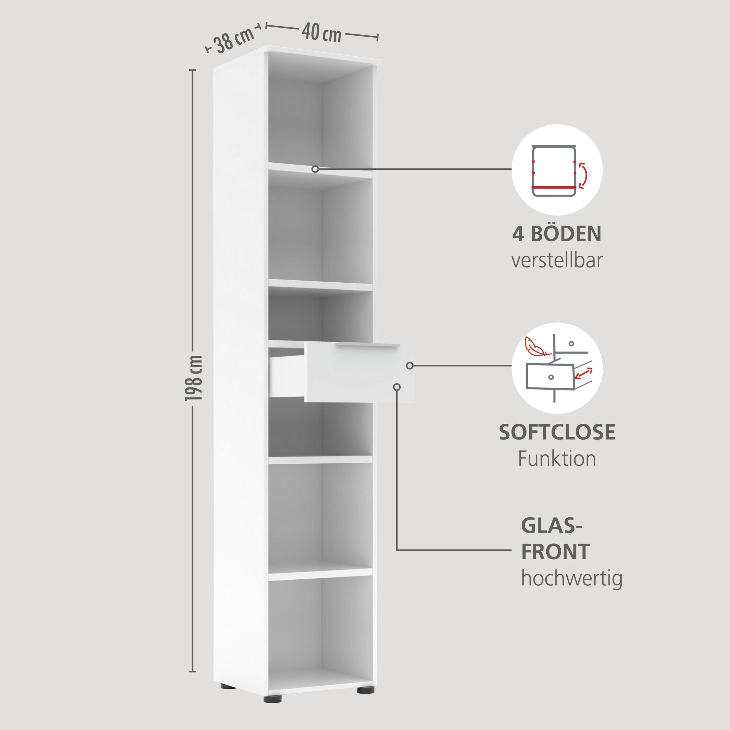 - Edles Design: Korpus in Weiß kombiniert mit luxuriösen Fronten aus weißem Glas.