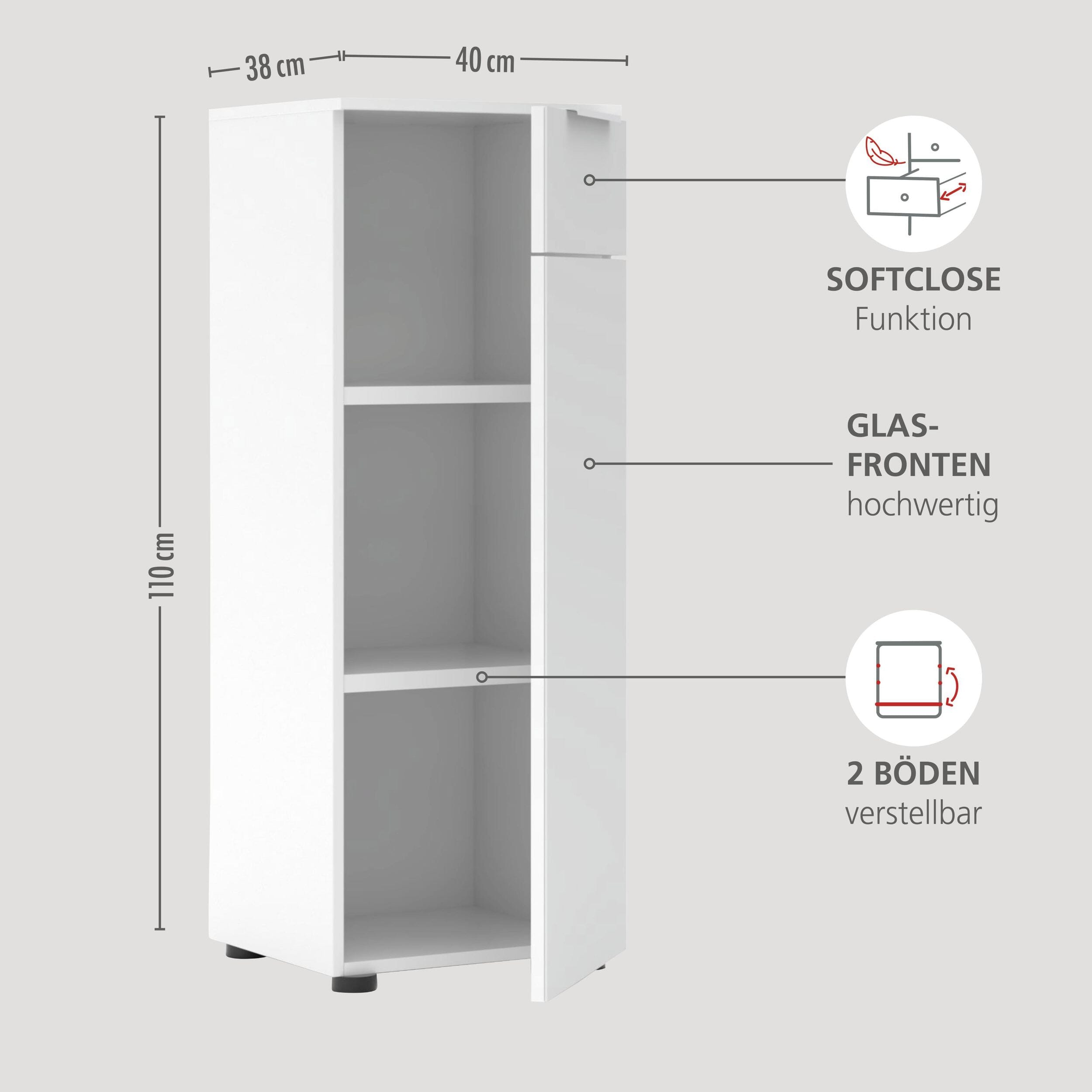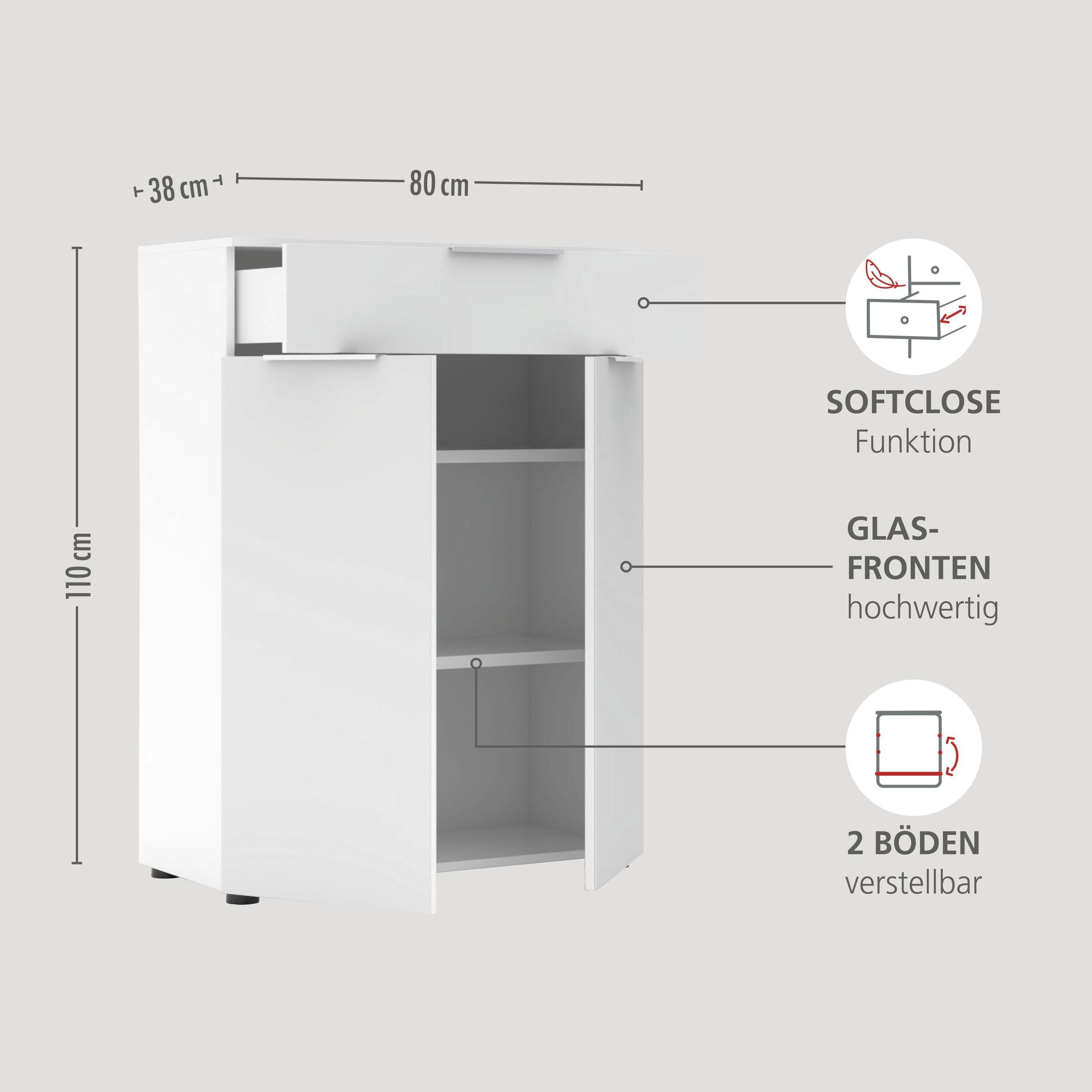 - Premium-Materialien: Hochwertiger Korpus in zeitlosem Weiß (kratzfest melaminbeschichtet) kombiniert mit exklusiven Fronten aus weißem Glas.