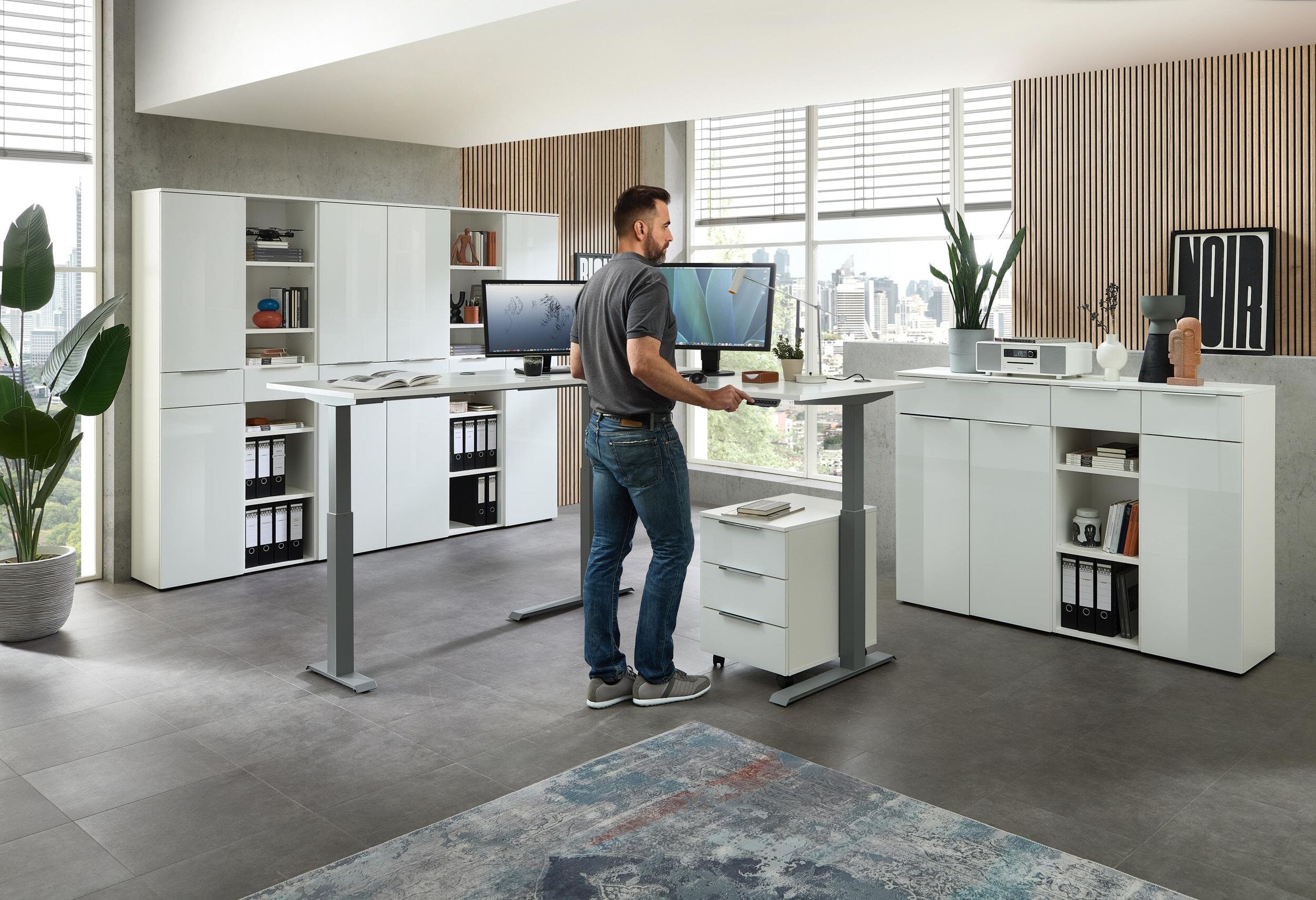 - Flexibilität & Stabilität: Schreibtisch links oder rechts montierbar; Schränke inklusive höhenverstellbarer Gleiter zum Ausgleich von Bodenunebenheiten.