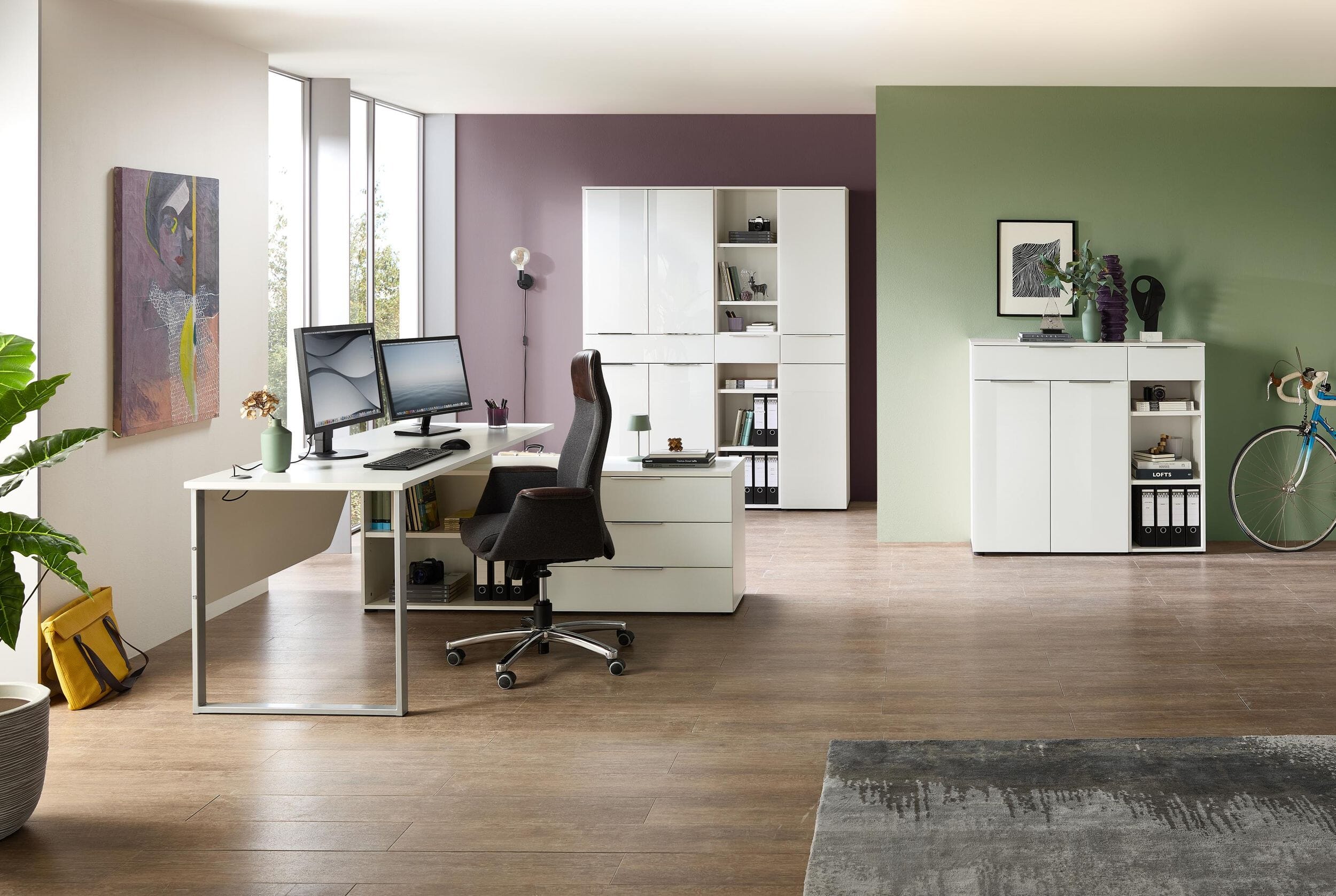 Büromöbel-Set SANTORIN VI Weiß & weißes Glas – 6-tlg. Komplettbüro mit Eckschreibtisch