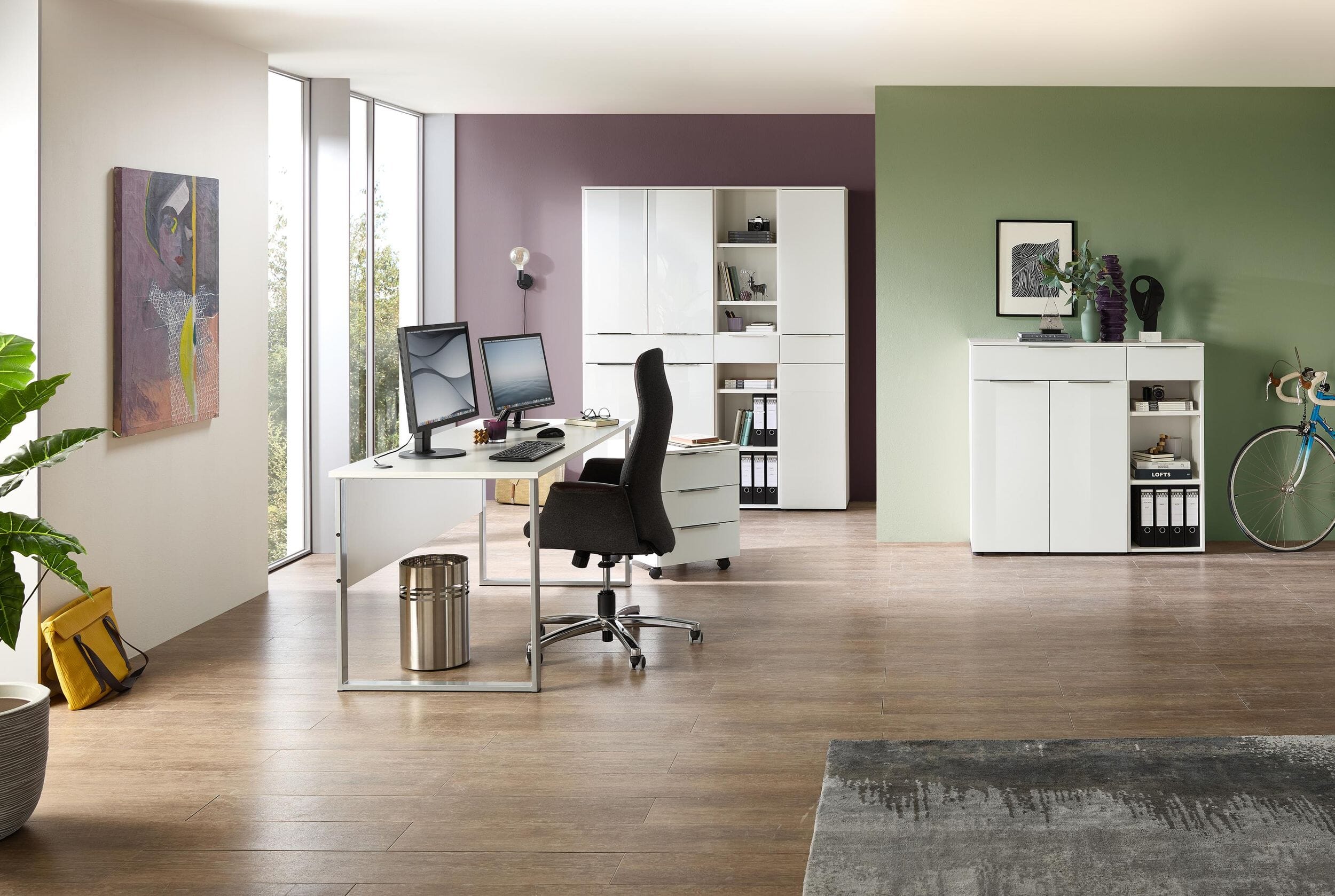 - Durchdachter Stauraum: Kombination aus Aktenschränken und Regalen für eine effiziente Büro-Organisation.