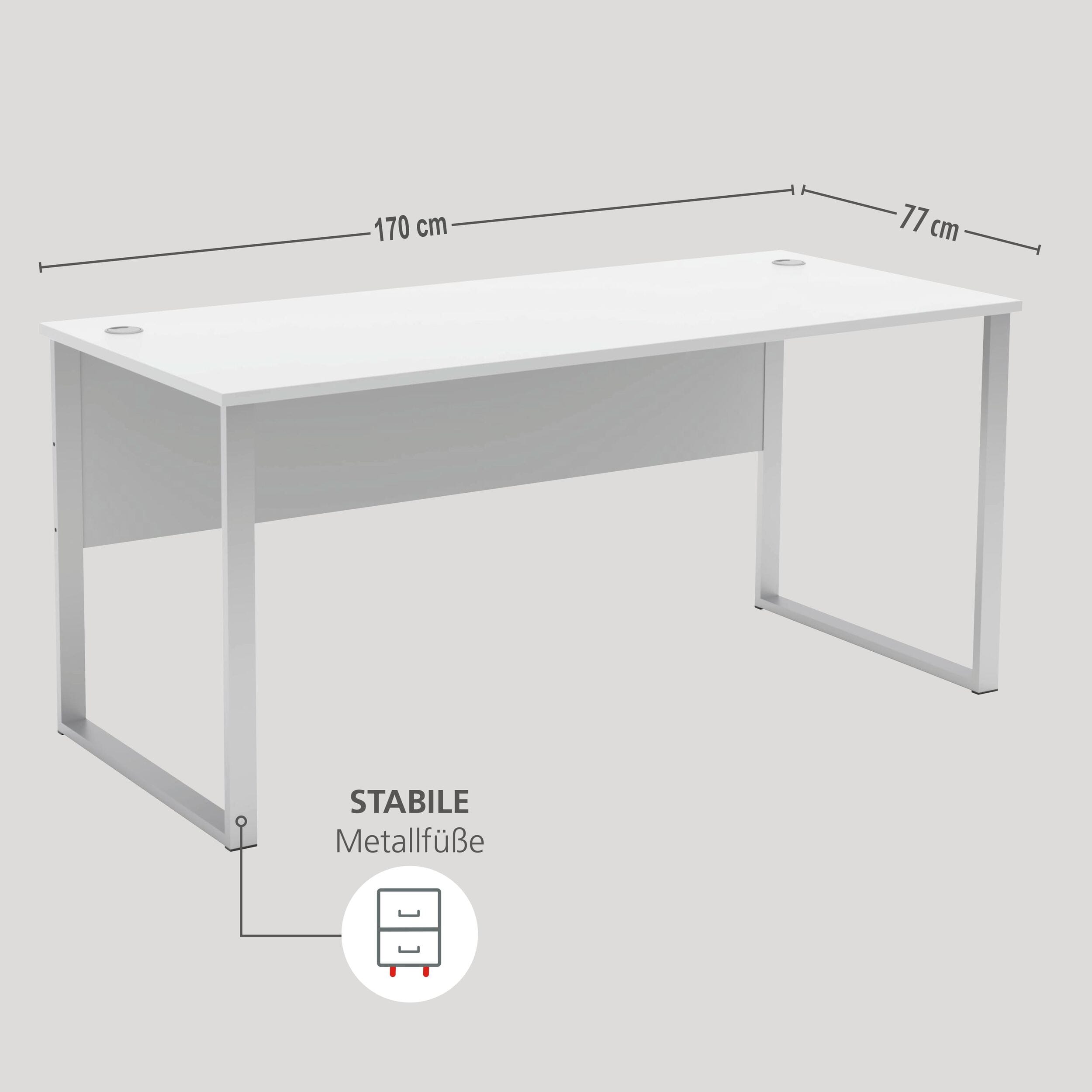 - Großzügige Arbeitsfläche: 170 cm breiter Schreibtisch mit robustem Metallgestell in Silber Matt.