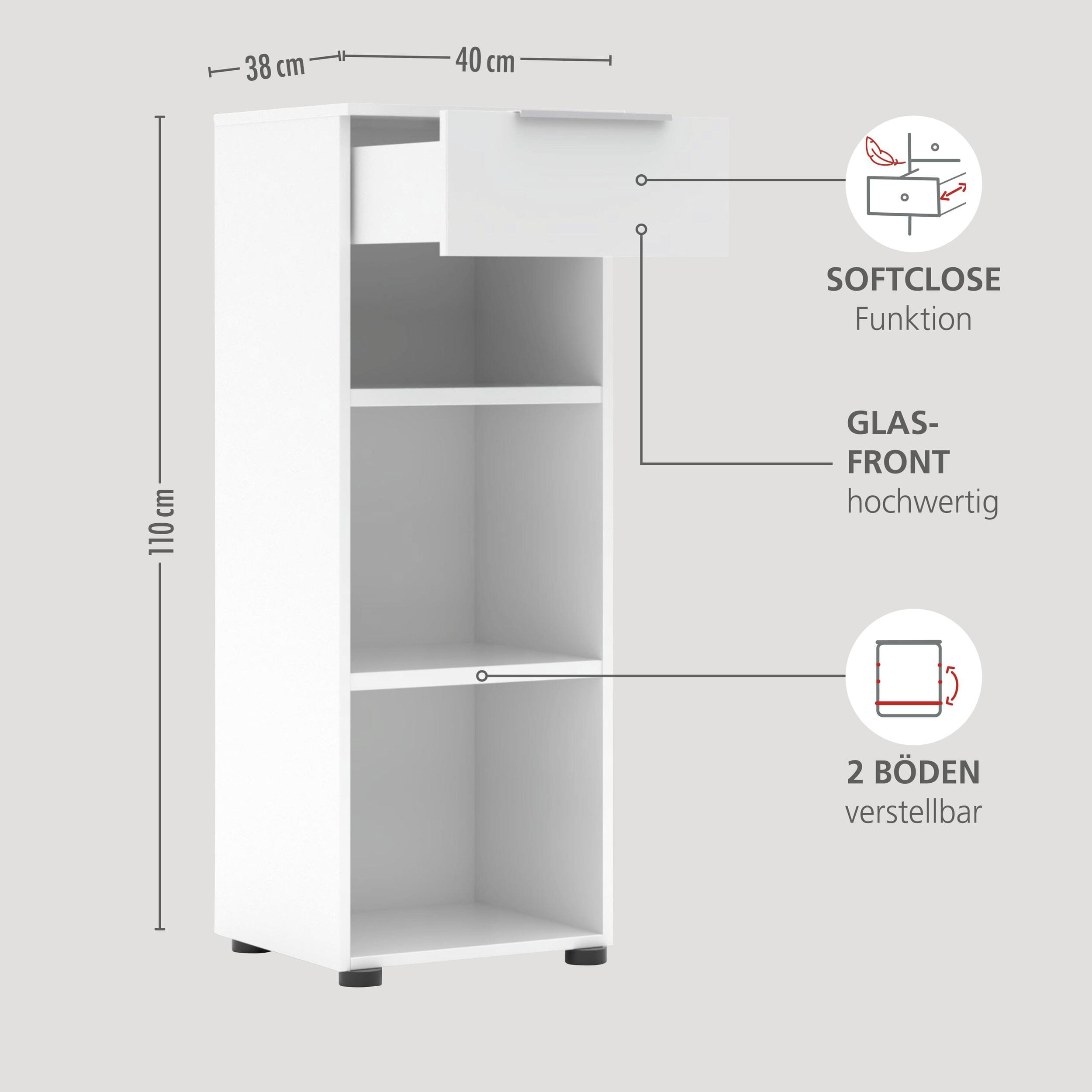 - Edles Material: Korpus in Weiß mit luxuriösen Fronten aus weißem Glas für ein helles Ambiente.