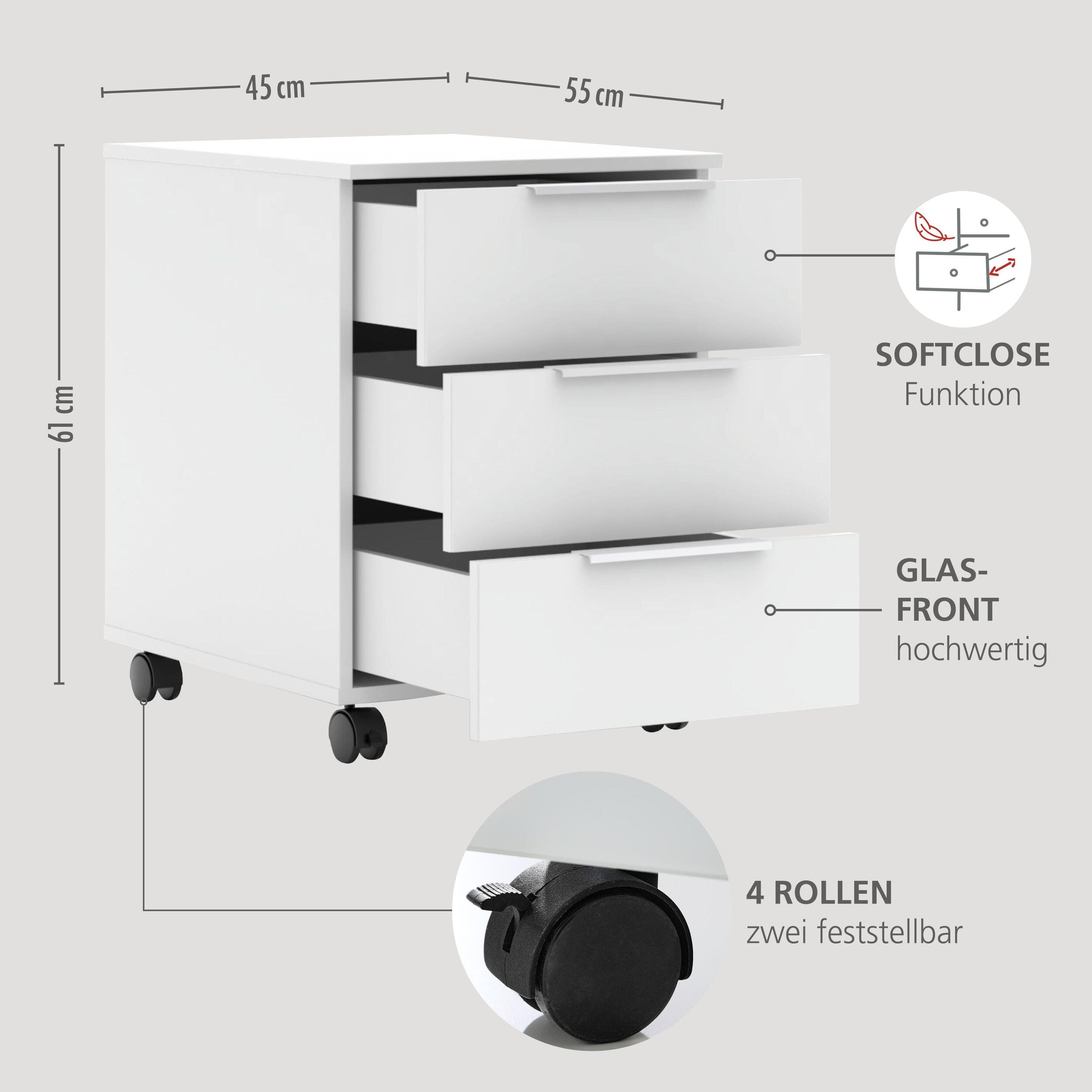 - Rollcontainer: 3 Schubkästen mit Softclose, 4 Rollen (2 feststellbar), Maße ca. 45 / 61 / 55 cm.