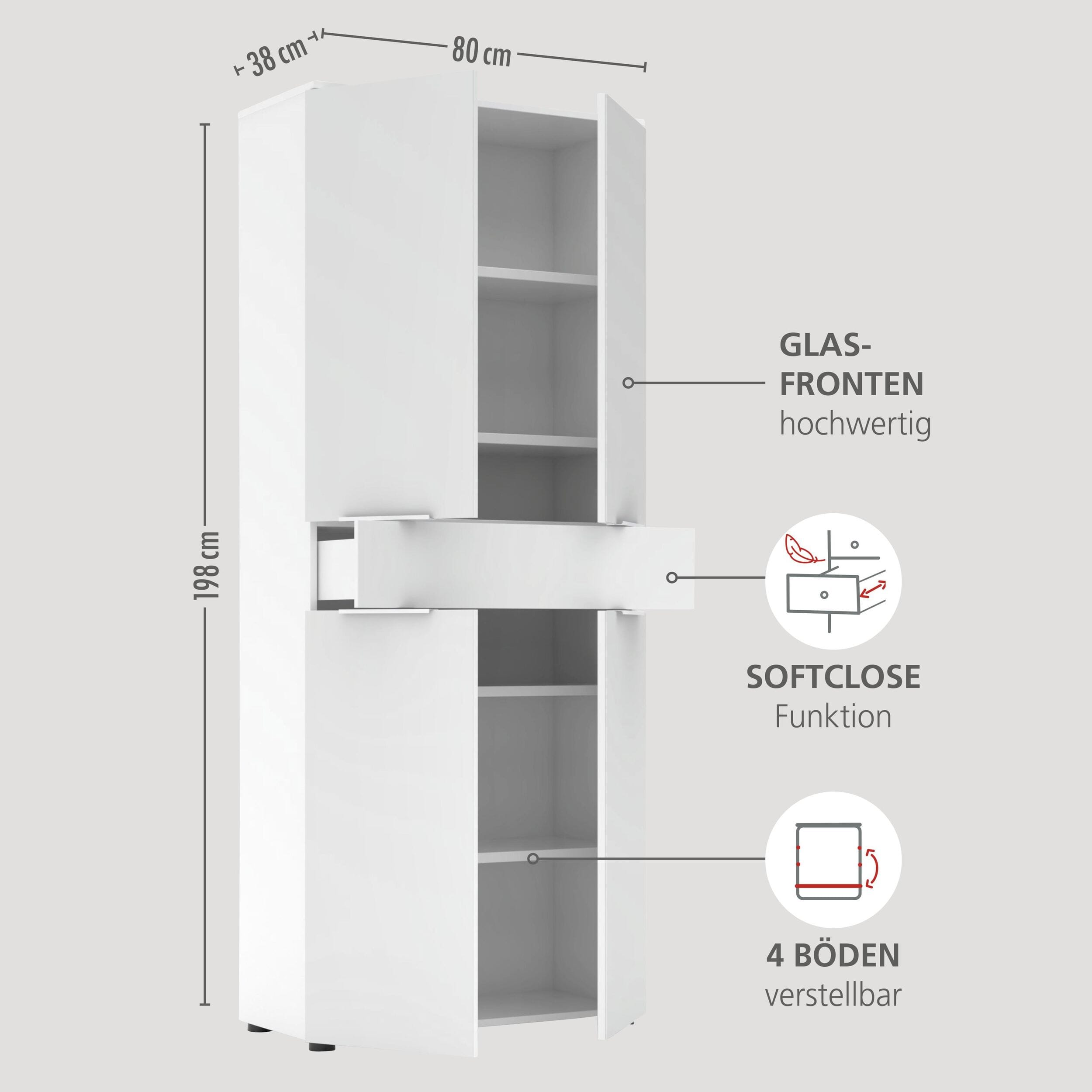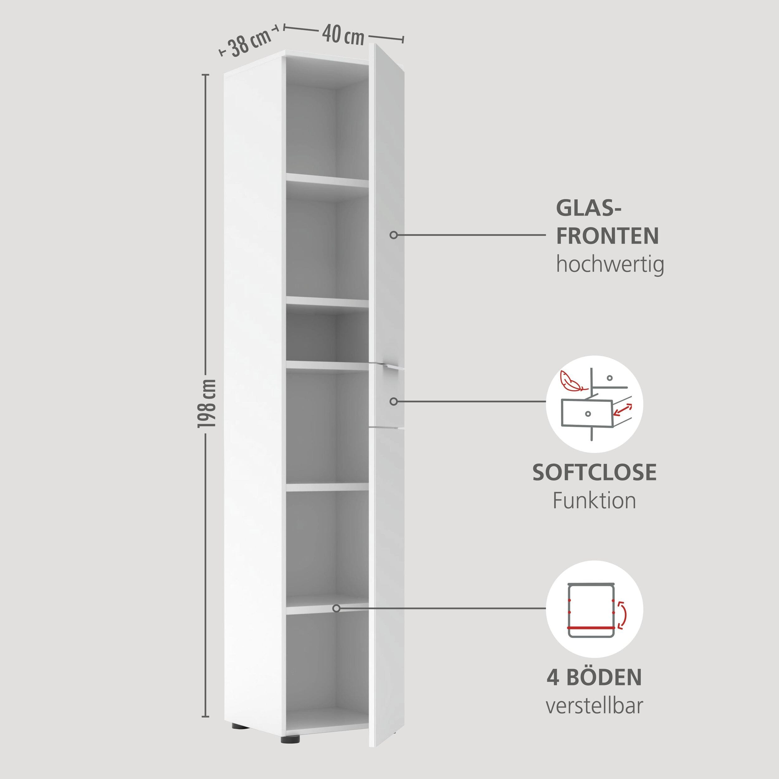 - Edle Materialkombination: Weißer Korpus mit hochwertiger Melaminharzbeschichtung und Fronten aus weißem Glas.