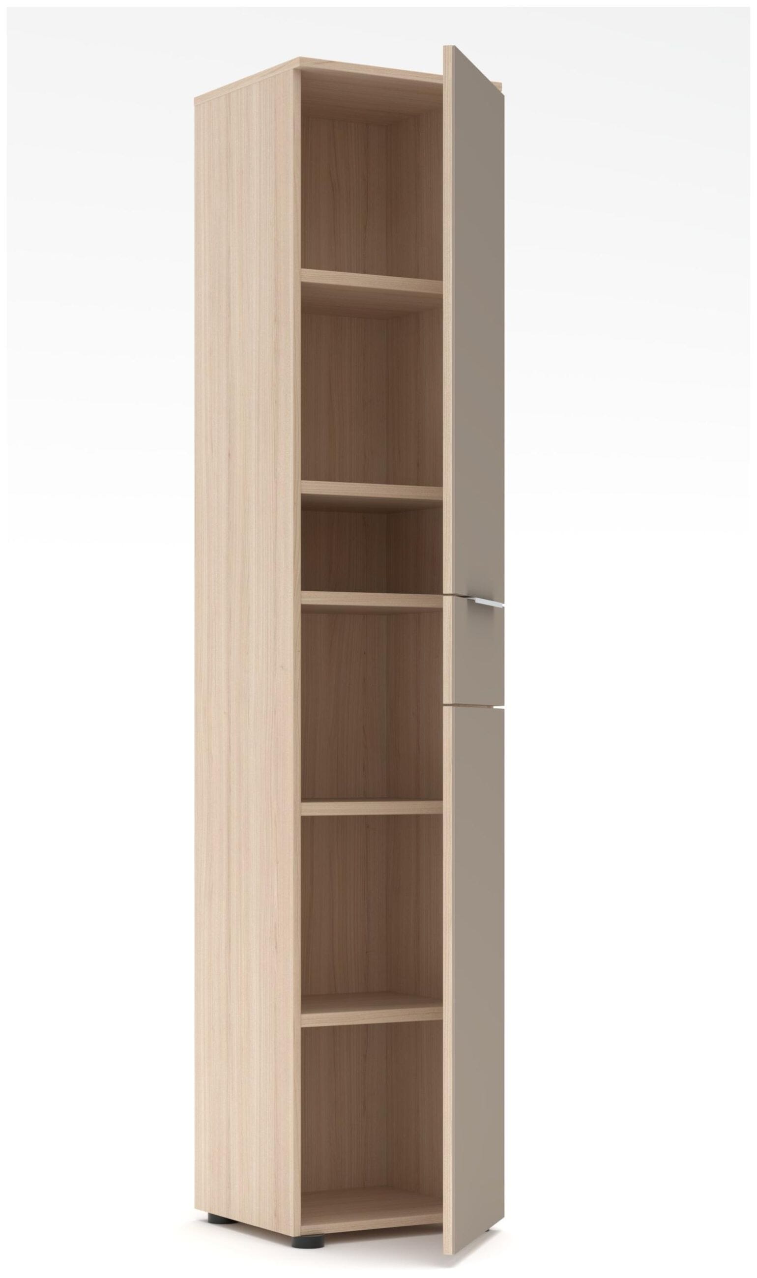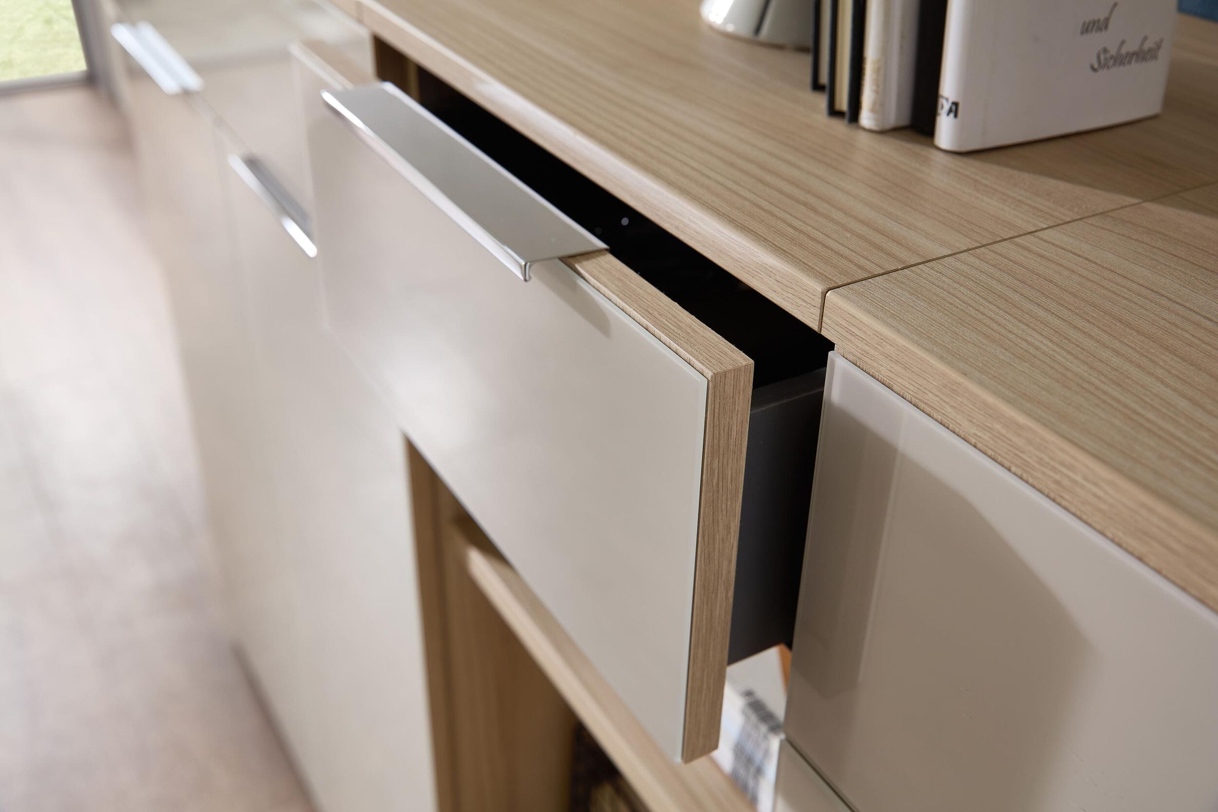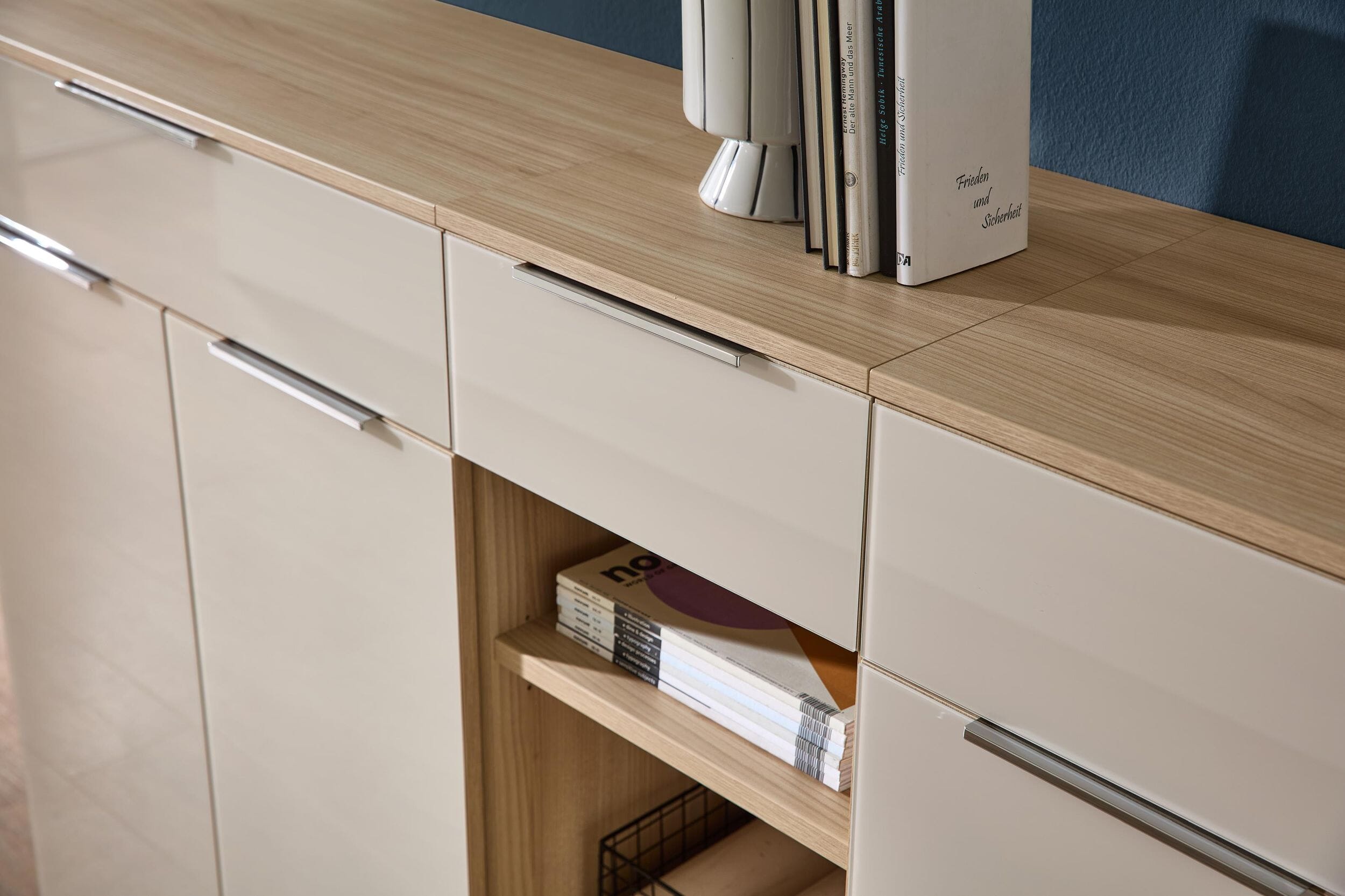 - Material: Melaminharzbeschichtete Oberflächen in Riva Eiche, Fronten aus edlem, aufgeklebtem Glas in Cashmere