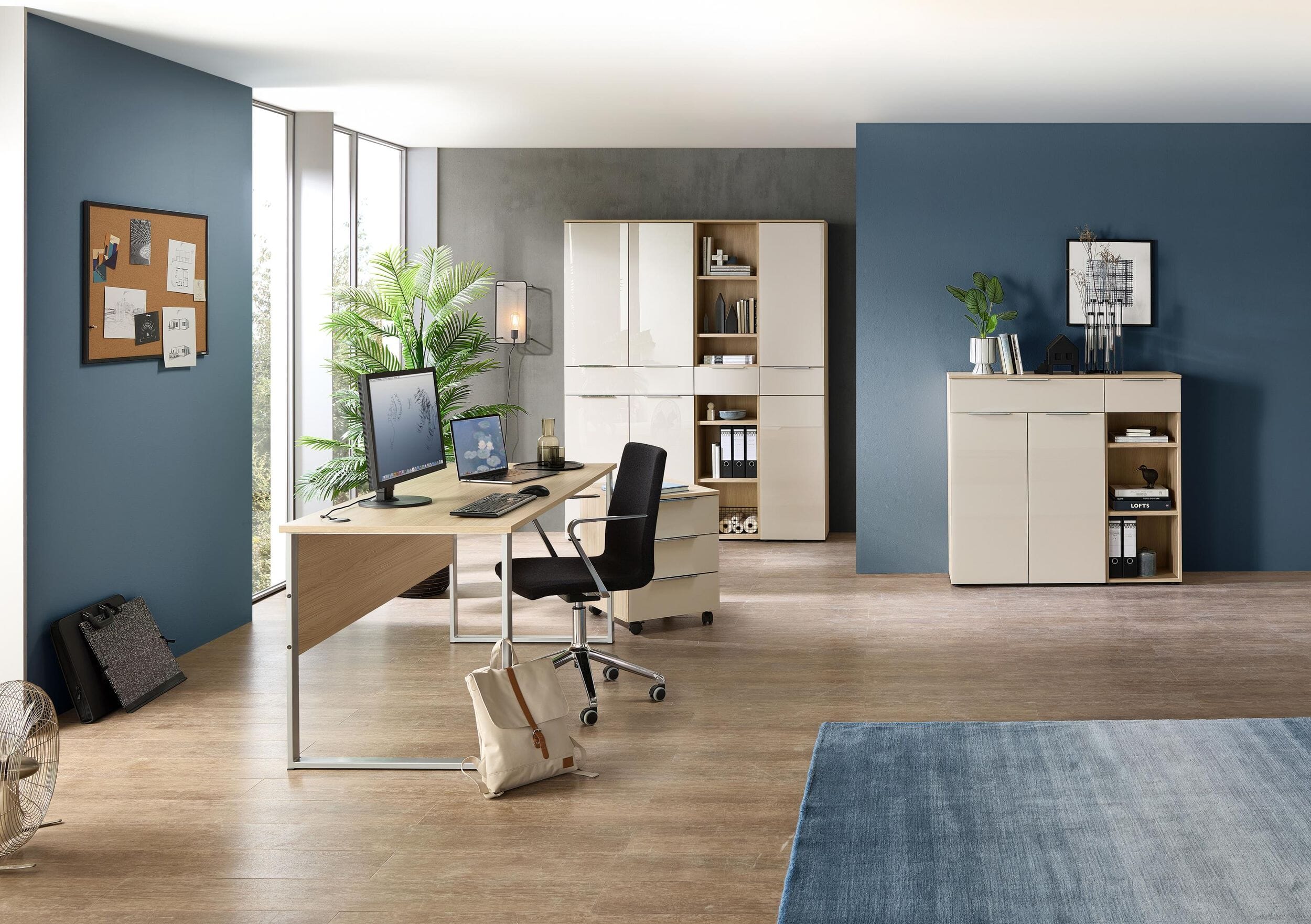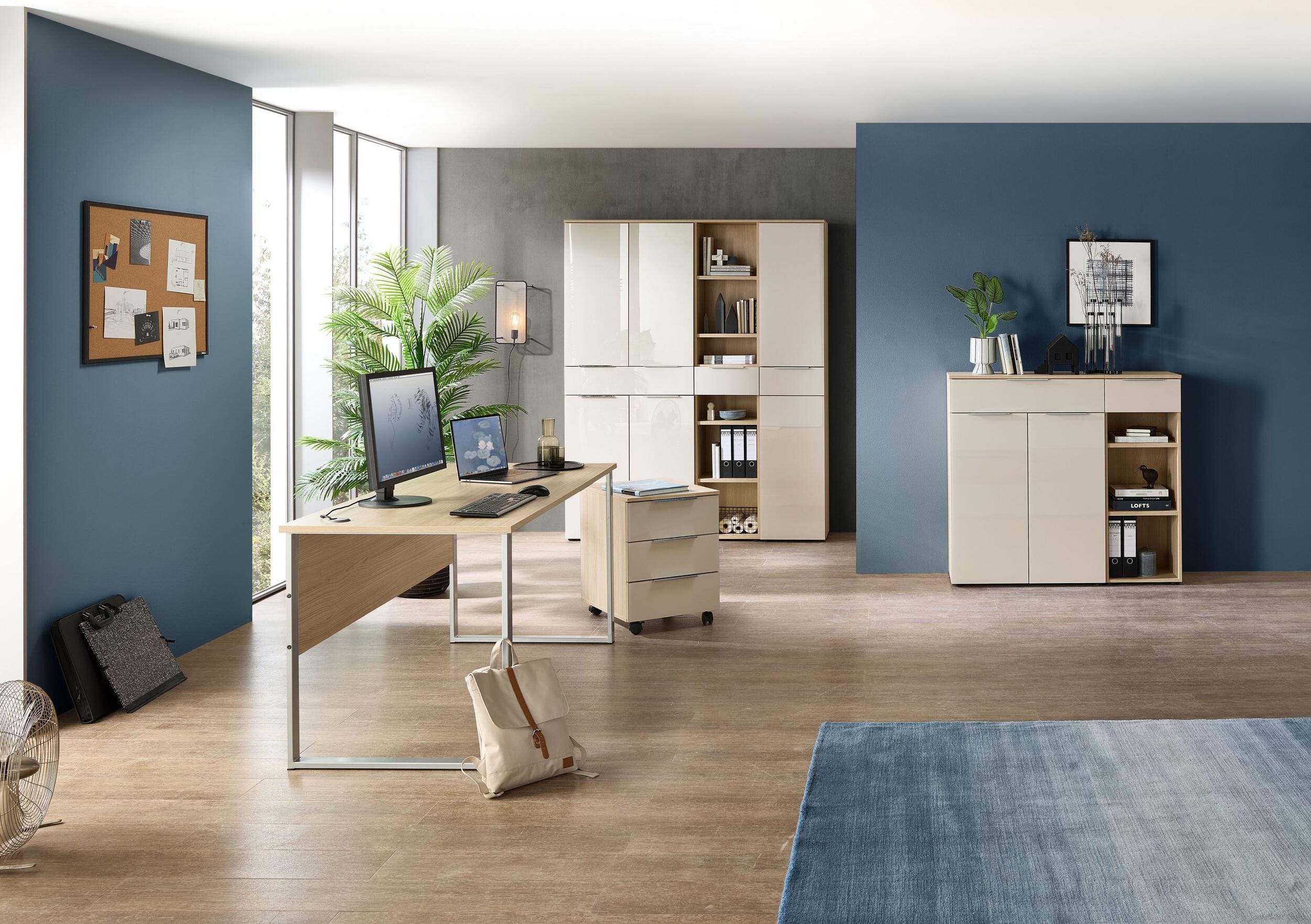 Komplettbüro Büro-Set SANTORIN V Riva Eiche & Glas Cashmere 7-teilig