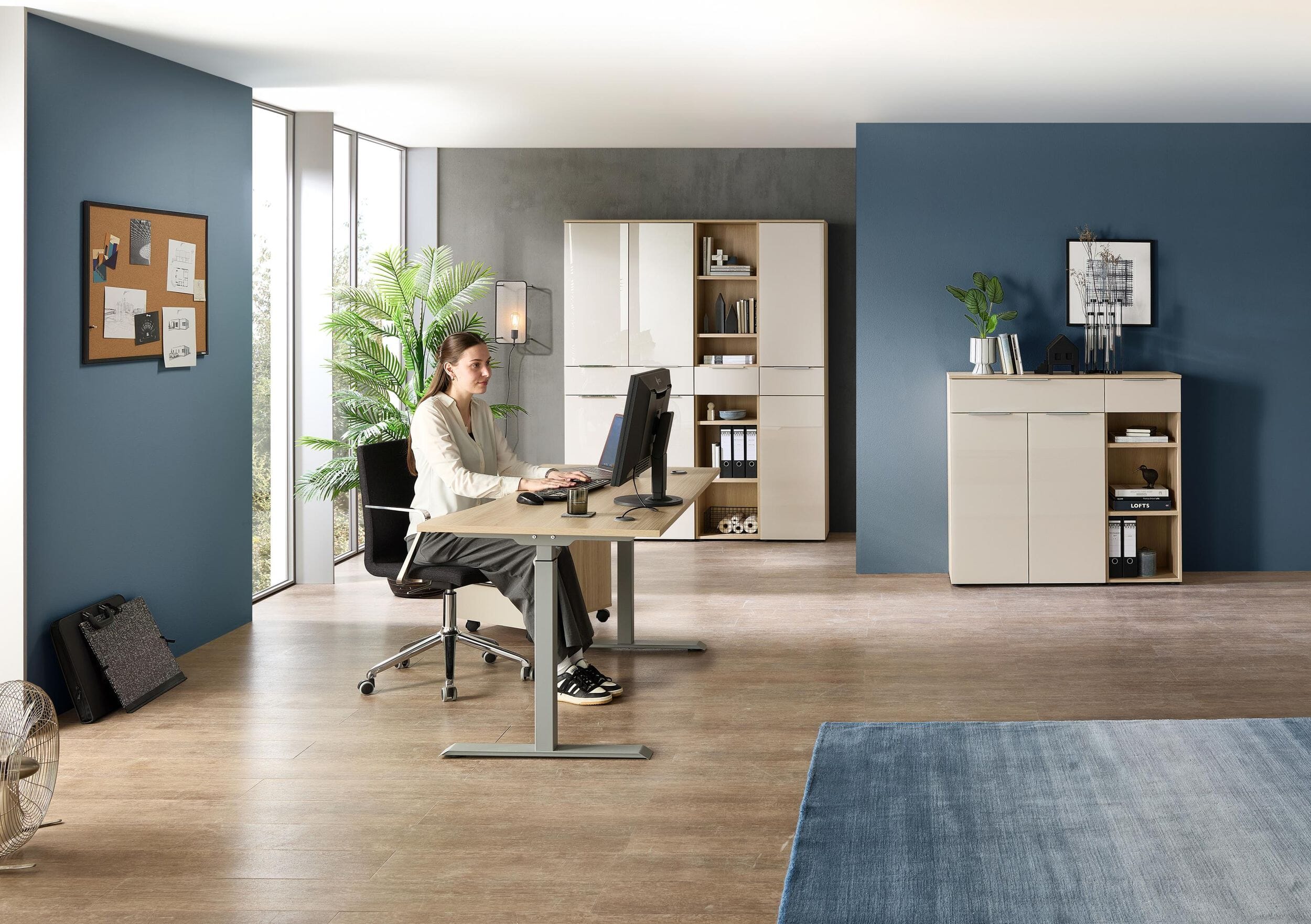 Erschaffen Sie sich ein Arbeitsumfeld, das Professionalität und moderne Eleganz ausstrahlt. Das 7-teilige Büro-Komplettset der Serie Santorin bietet Ihnen eine perfekt abgestimmte Gesamtlösung für Ihr Home-Office oder gewerbliche Büroräume. Die Kombination aus der natürlichen Wärme der Riva Eiche und den luxuriösen Glasfronten in Cashmere sorgt für ein helles, einladendes Ambiente. Mit diesem Set erhalten Sie eine großzügige Arbeitsfläche und ein durchdachtes Stauraum-System, das keine Wünsche offen lässt.
