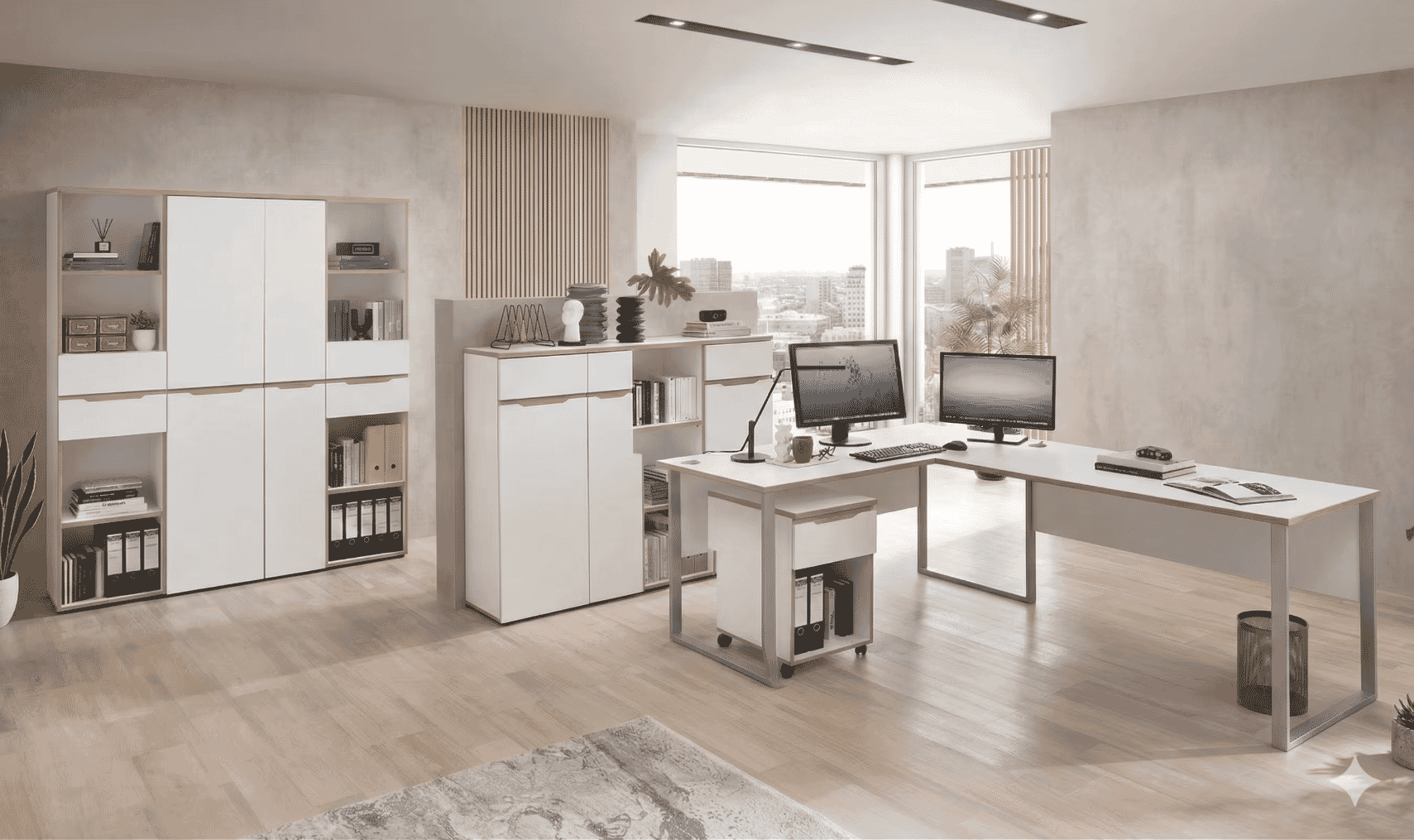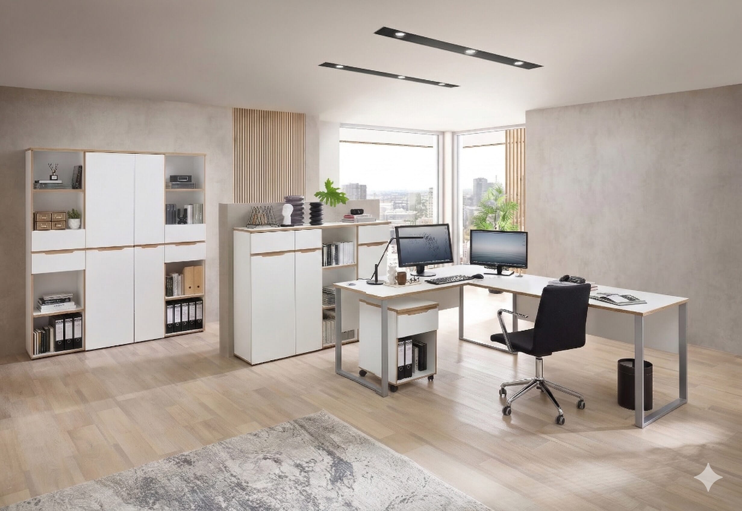 Stellen Sie sich ein Büro vor, das nicht nur perfekt organisiert ist, sondern auch eine Atmosphäre von Professionalität, Helligkeit und Ruhe ausstrahlt.