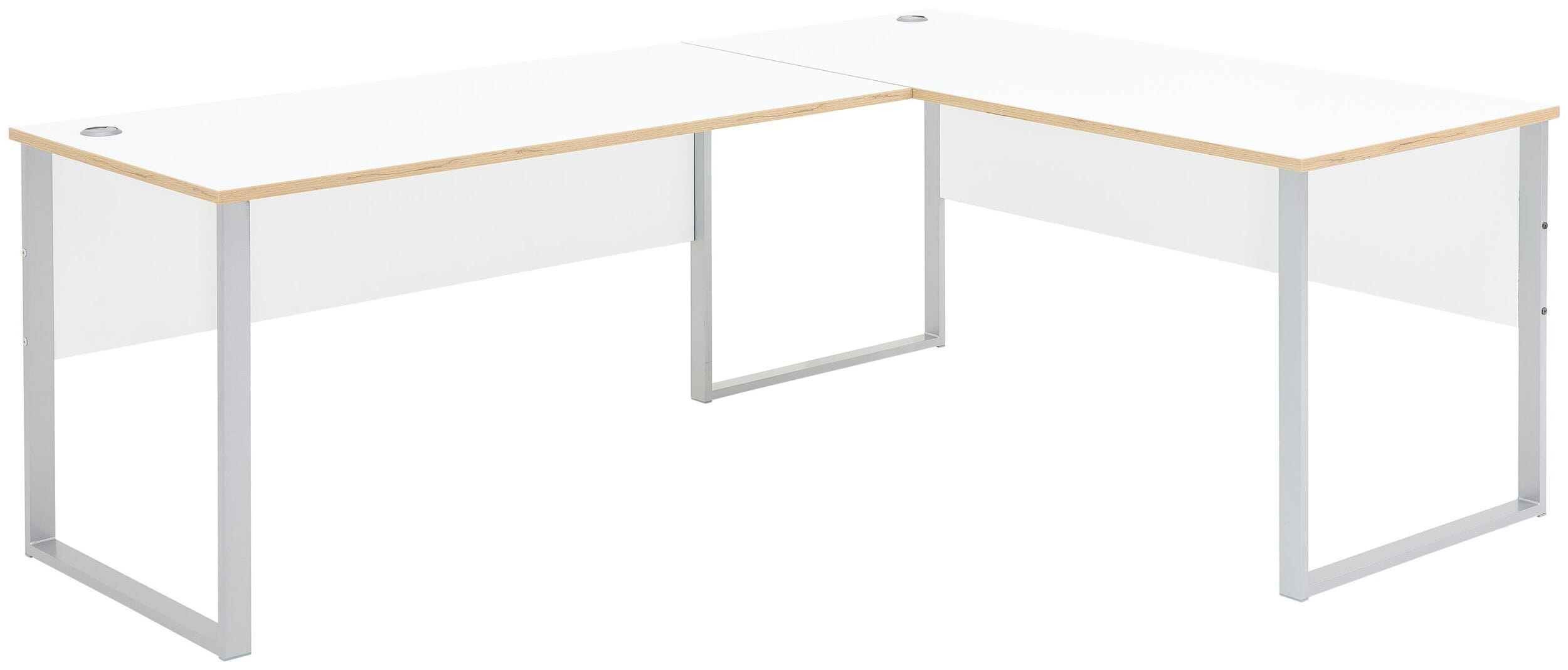 - 1x Großer Eckschreibtisch: Metallgestell Silber matt, flexibel links oder rechts montierbar (L/H/T: 229 x 77 x 170 cm)