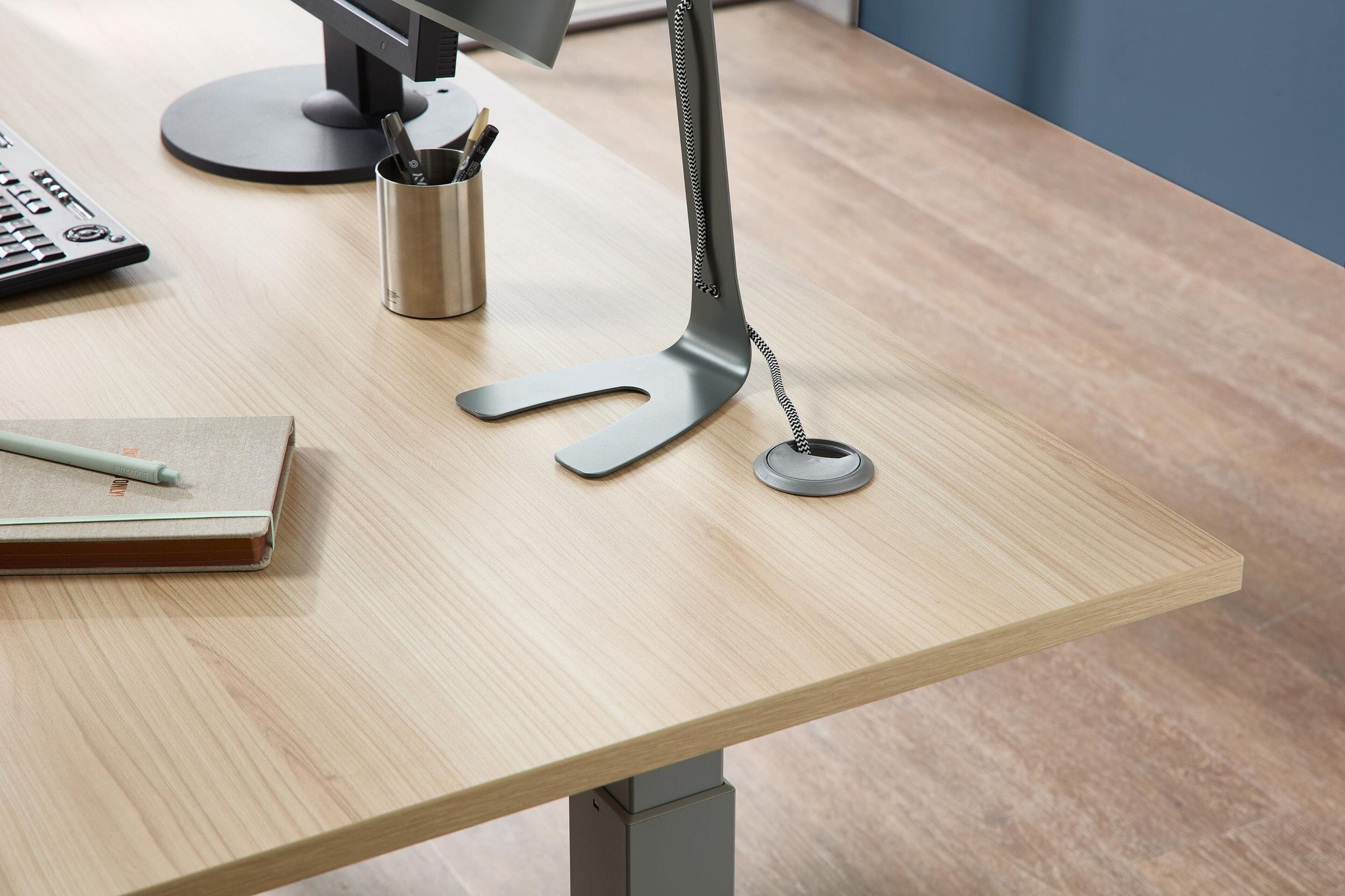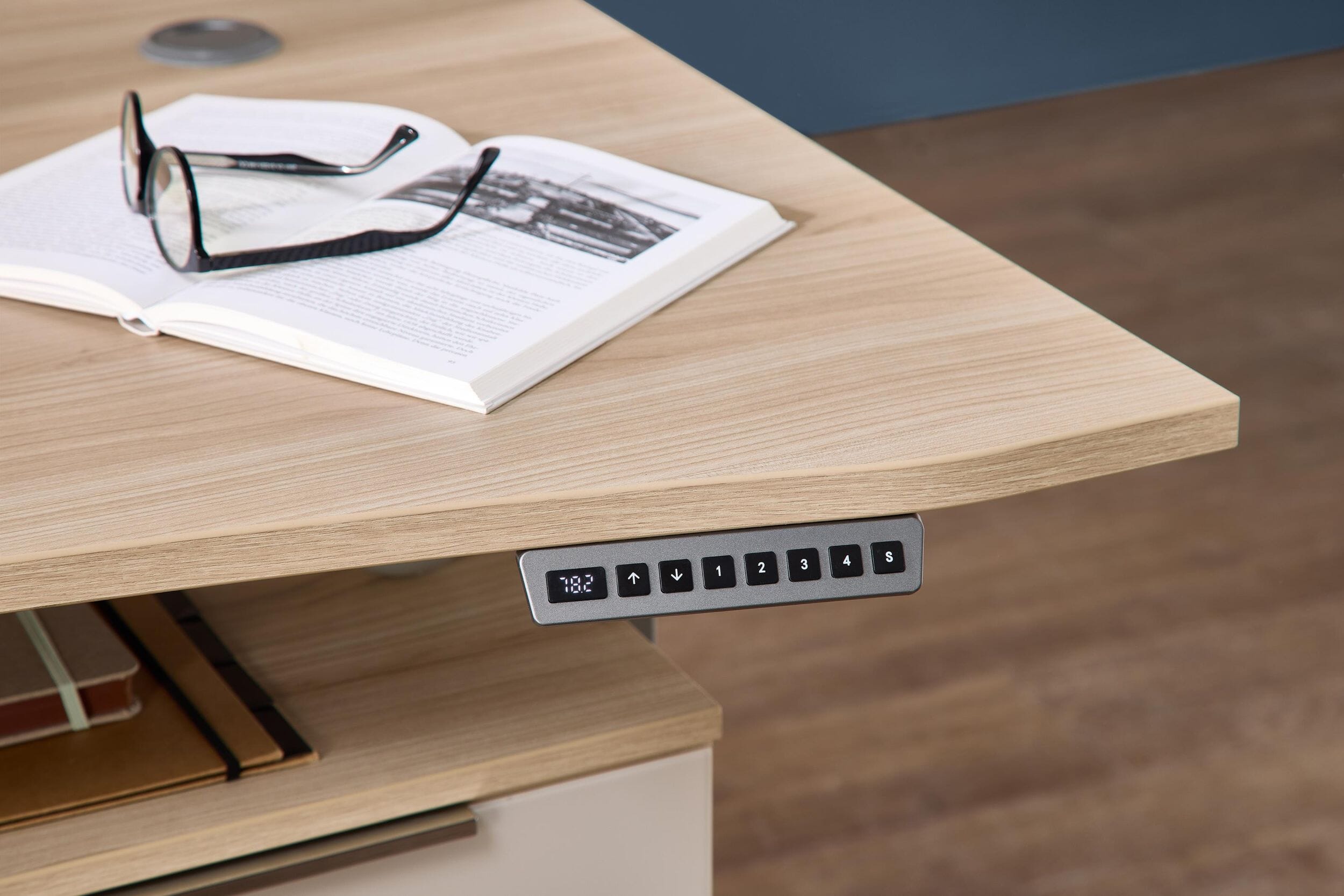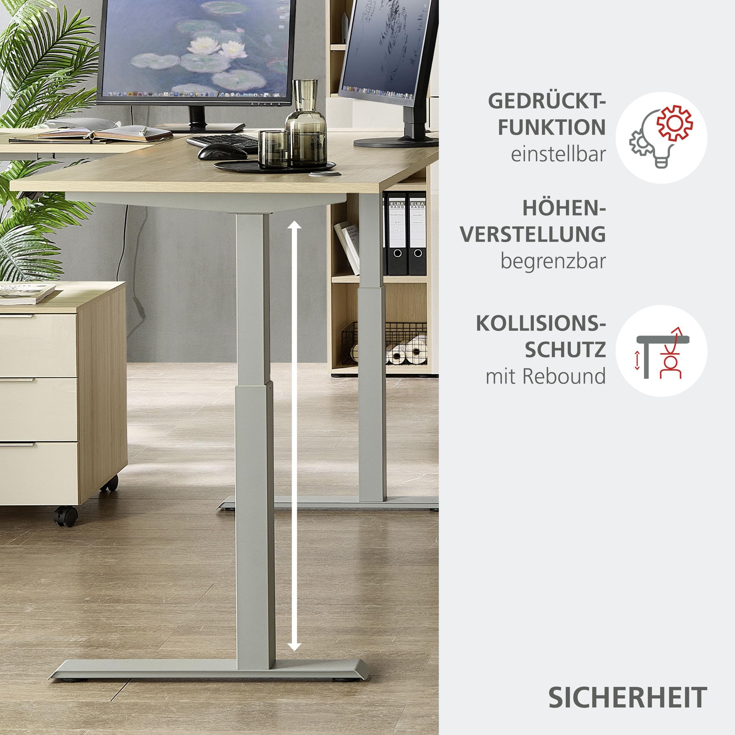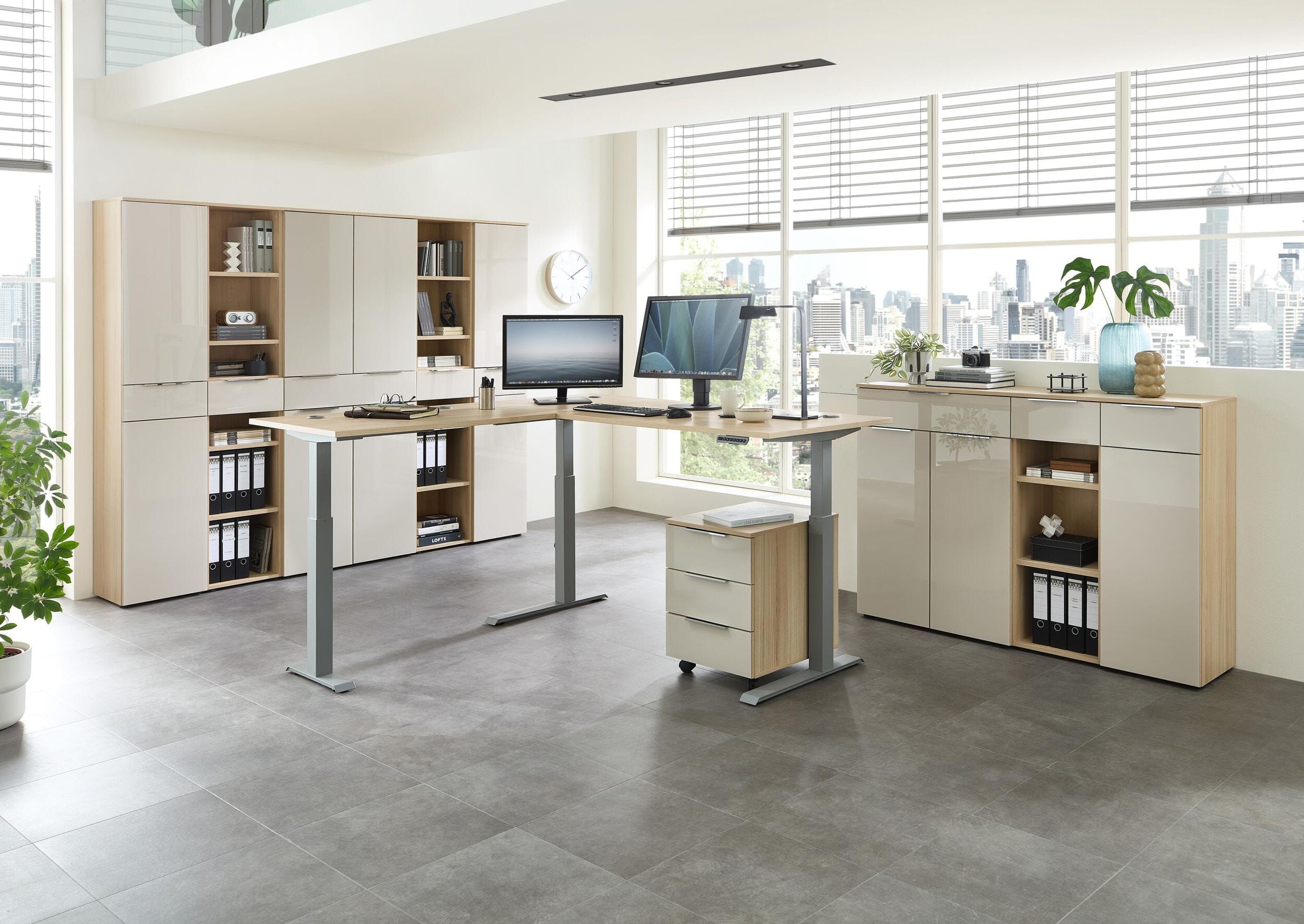- Ausstattung: Elektrisch höhenverstellbarer Winkelschreibtisch, Softclose-Systeme, Metallgriffe in Chrom