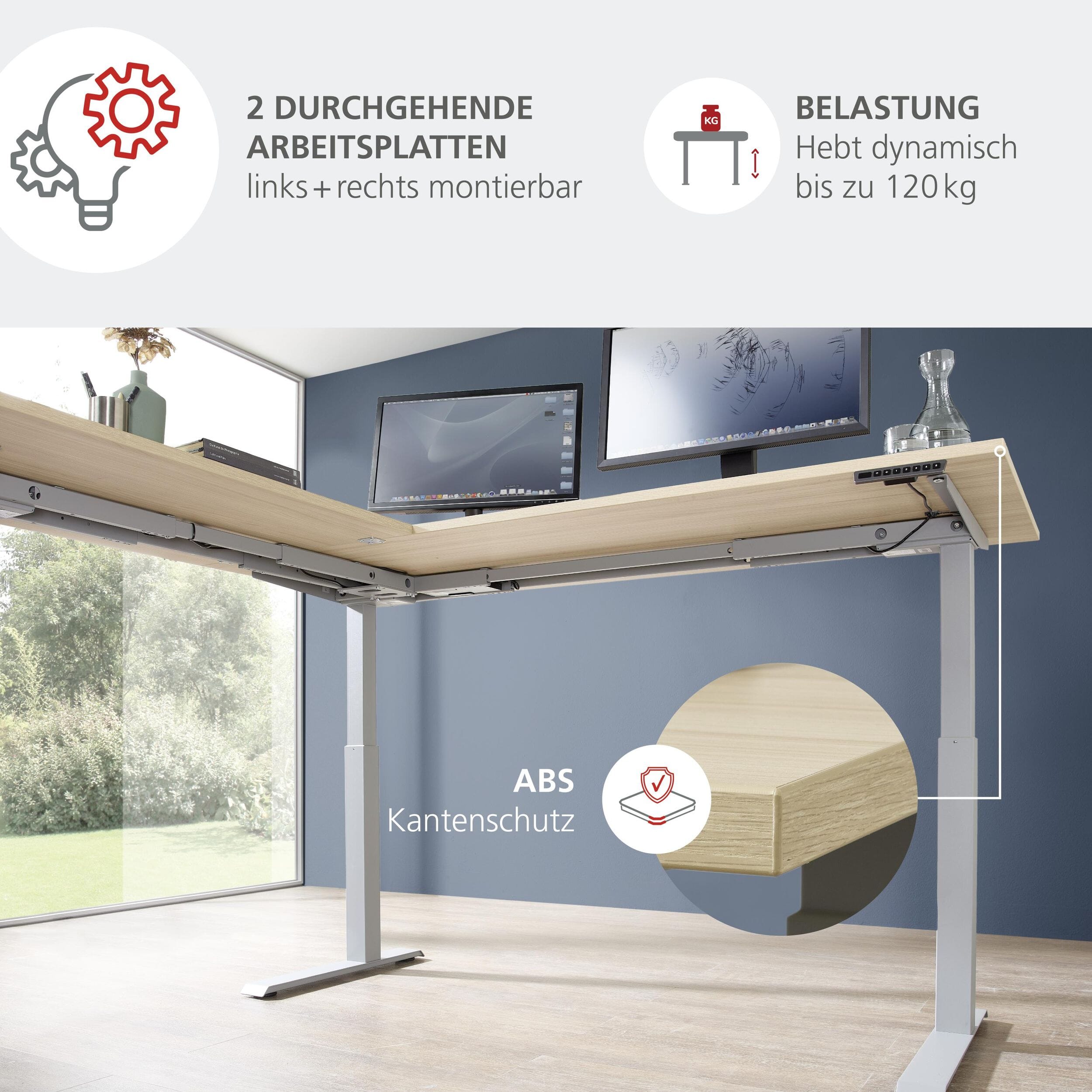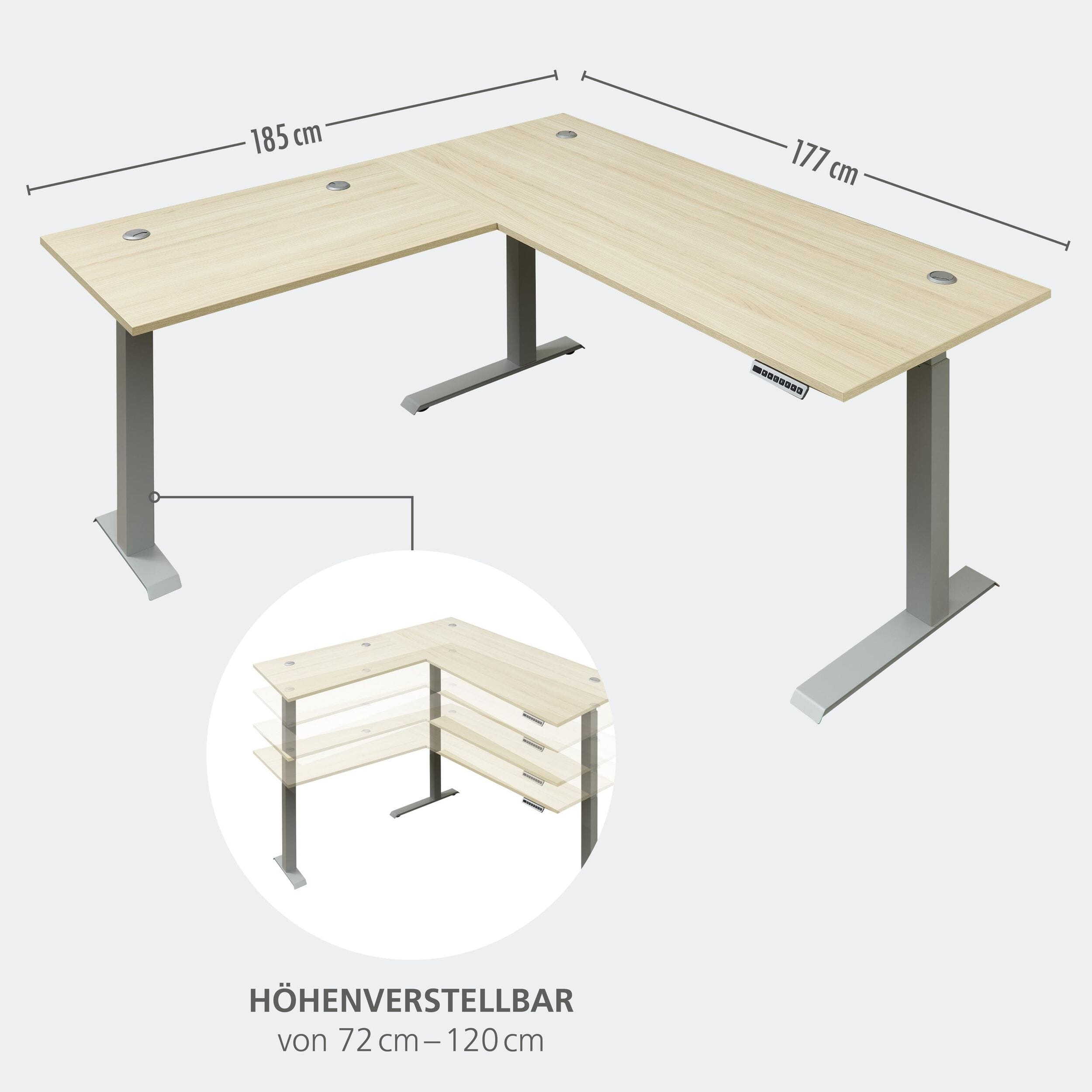 - Winkelschreibtisch (Typ 26): Elektrisch höhenverstellbar (72-120 cm) mit Memory-Funktion, Maße ca. 185/177 cm Links/Rechts montierbar.