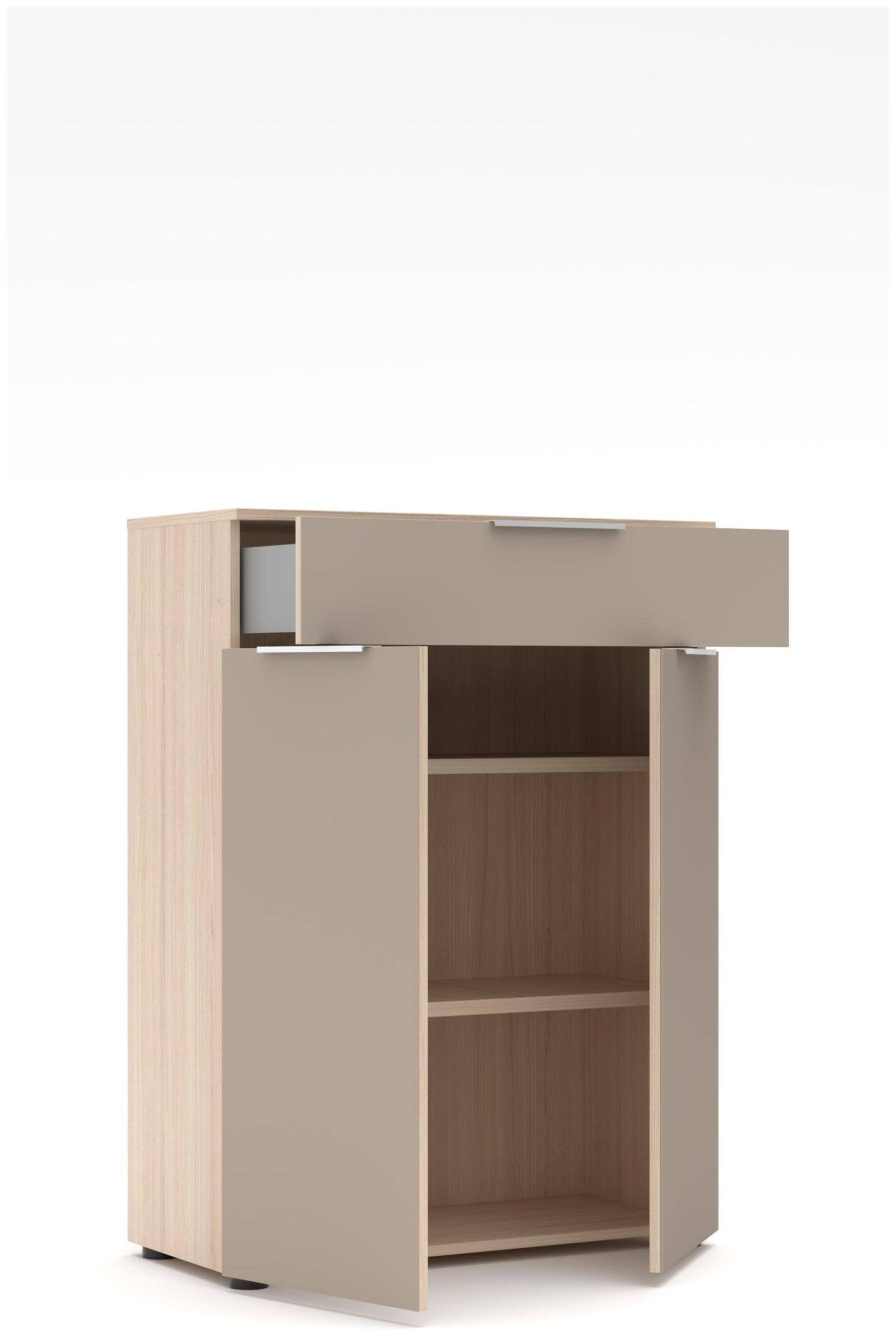 - Material: Melaminharzbeschichtete Oberflächen in Riva Eiche, Fronten aus edlem, aufgeklebtem Glas in Cashmere