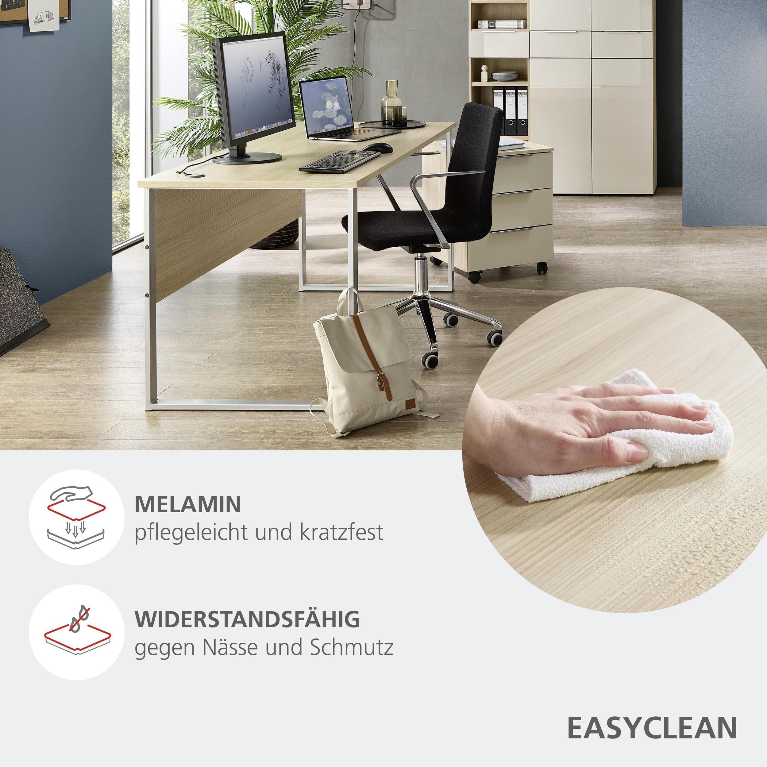 - Maße: 10-teiliges Set bestehend aus Schreibtisch (170 cm), Rollcontainer und umfangreicher Stauraumwand