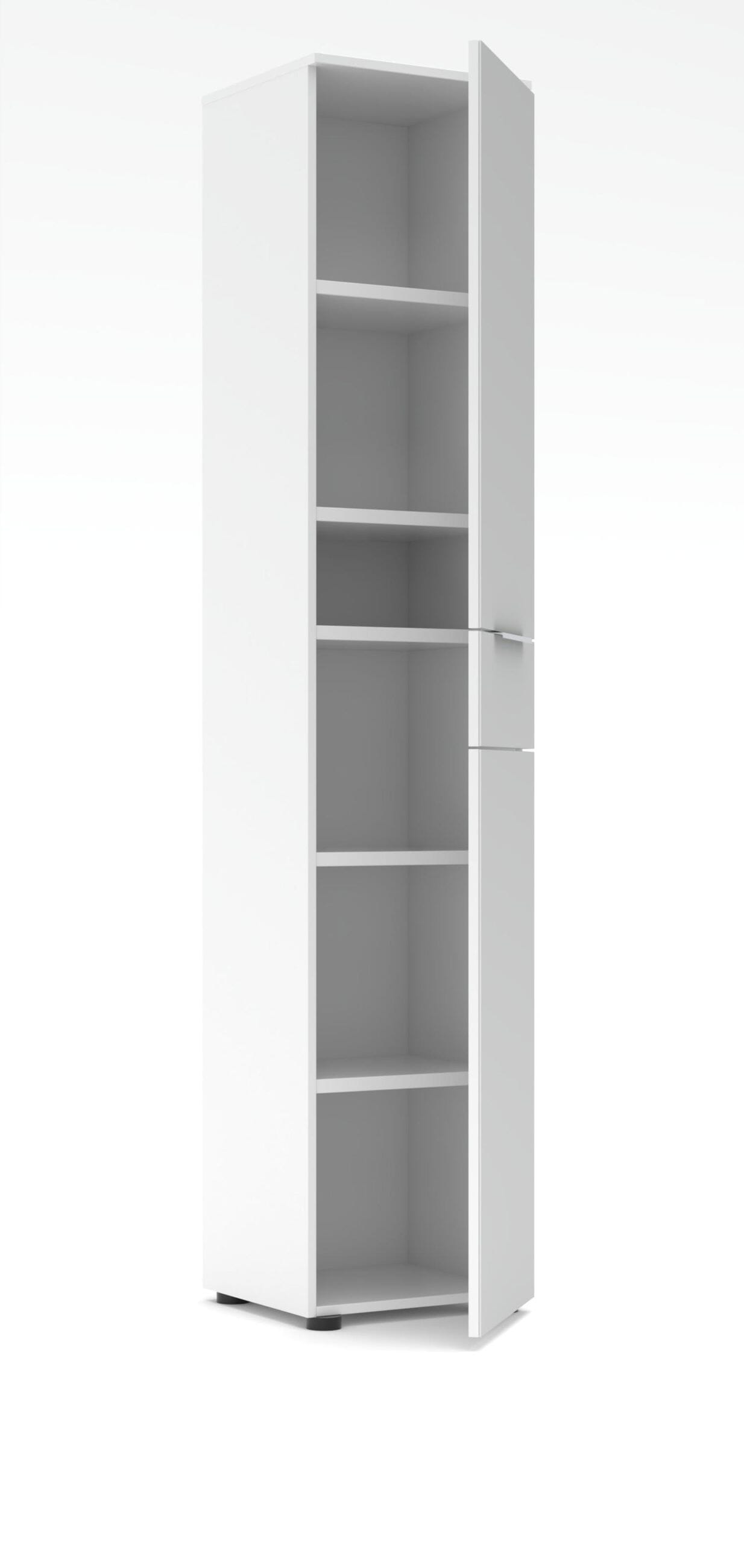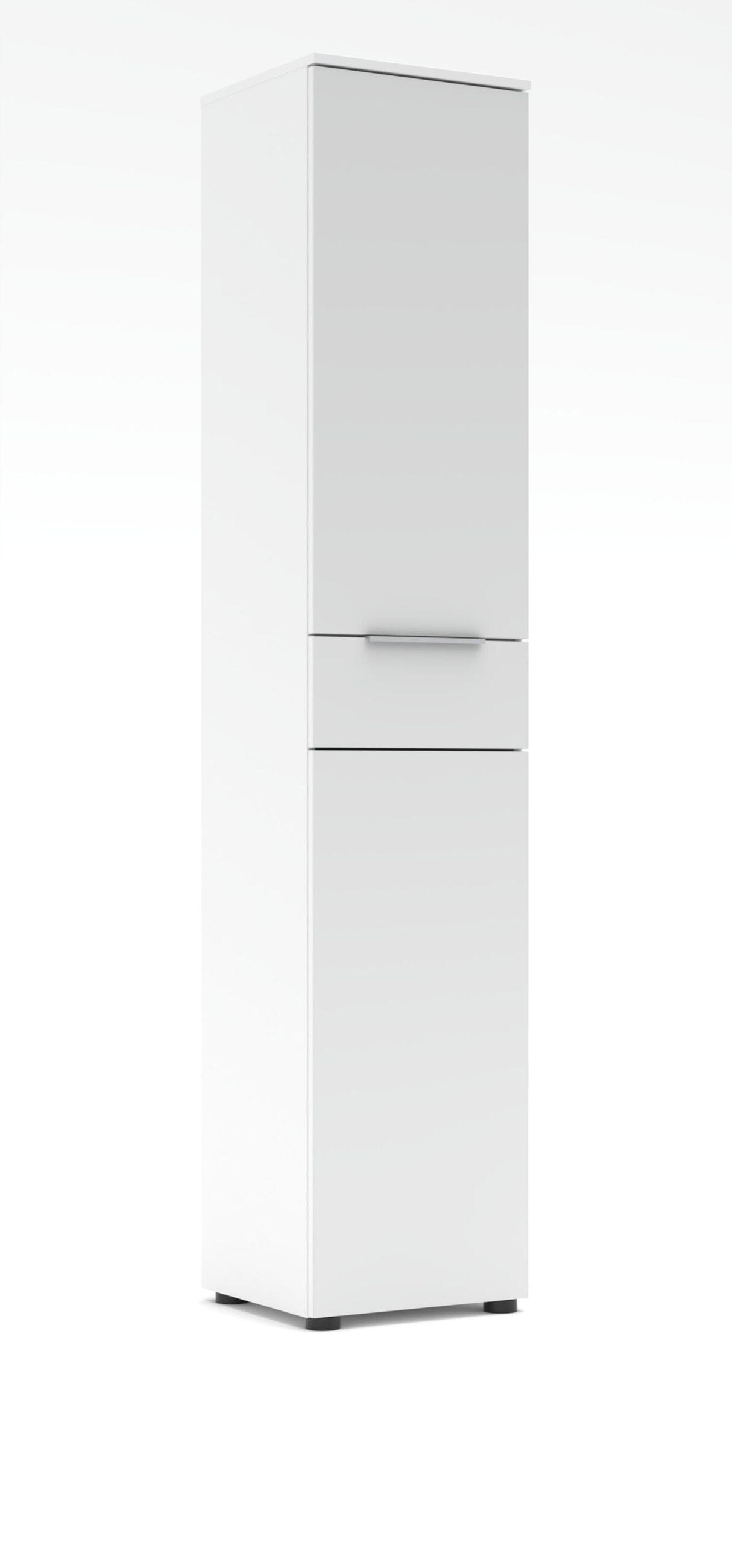 Maximieren Sie Ihren Stauraum mit Stil: Der schmale Hochschrank aus der Serie Santorin ist die ideale Lösung für eine effiziente Raumnutzung in Ihrem Arbeitszimmer. Mit seiner stattlichen Höhe von fast zwei Metern und der geringen Breite von nur 40 cm nutzt dieser Schrank die vertikale Fläche perfekt aus, ohne den Raum zu überladen. Die Kombination aus der hellen, zeitlosen Optik in Weiß und der eleganten weißen Glasfront verleiht Ihrem Büro ein exklusives und zugleich freundliches Ambiente.