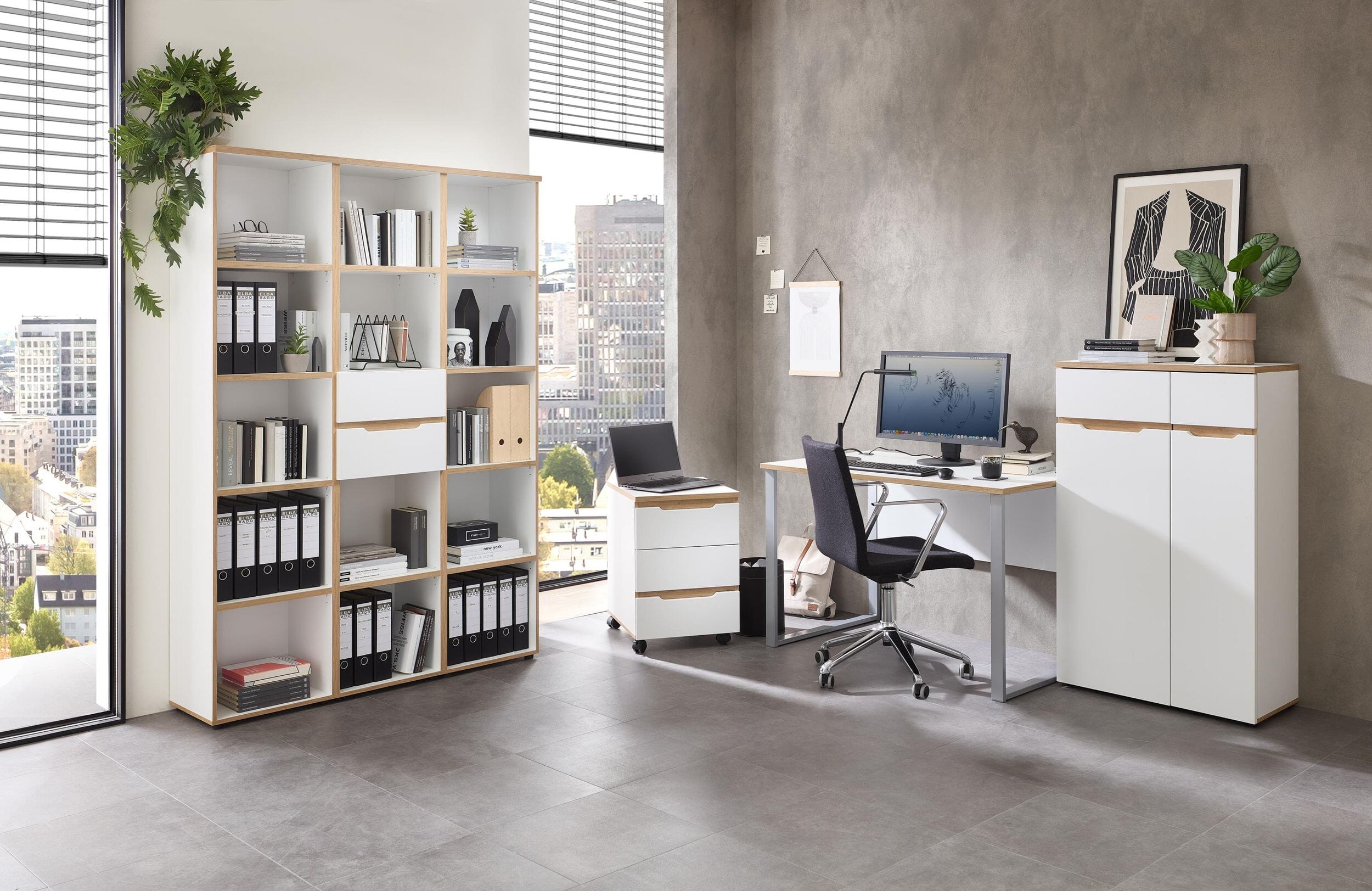 Das Büroregal MEMPHIS in Weiß Melamin mit Akzenten in Artisan Eiche Nachbildung ist ein absolutes Highlight für Ihr modernes Homeoffice. Die helle Farbgebung wirkt clean und einladend, während die warmen Holz-Absetzungen für eine natürliche und freundliche Arbeitsatmosphäre sorgen.