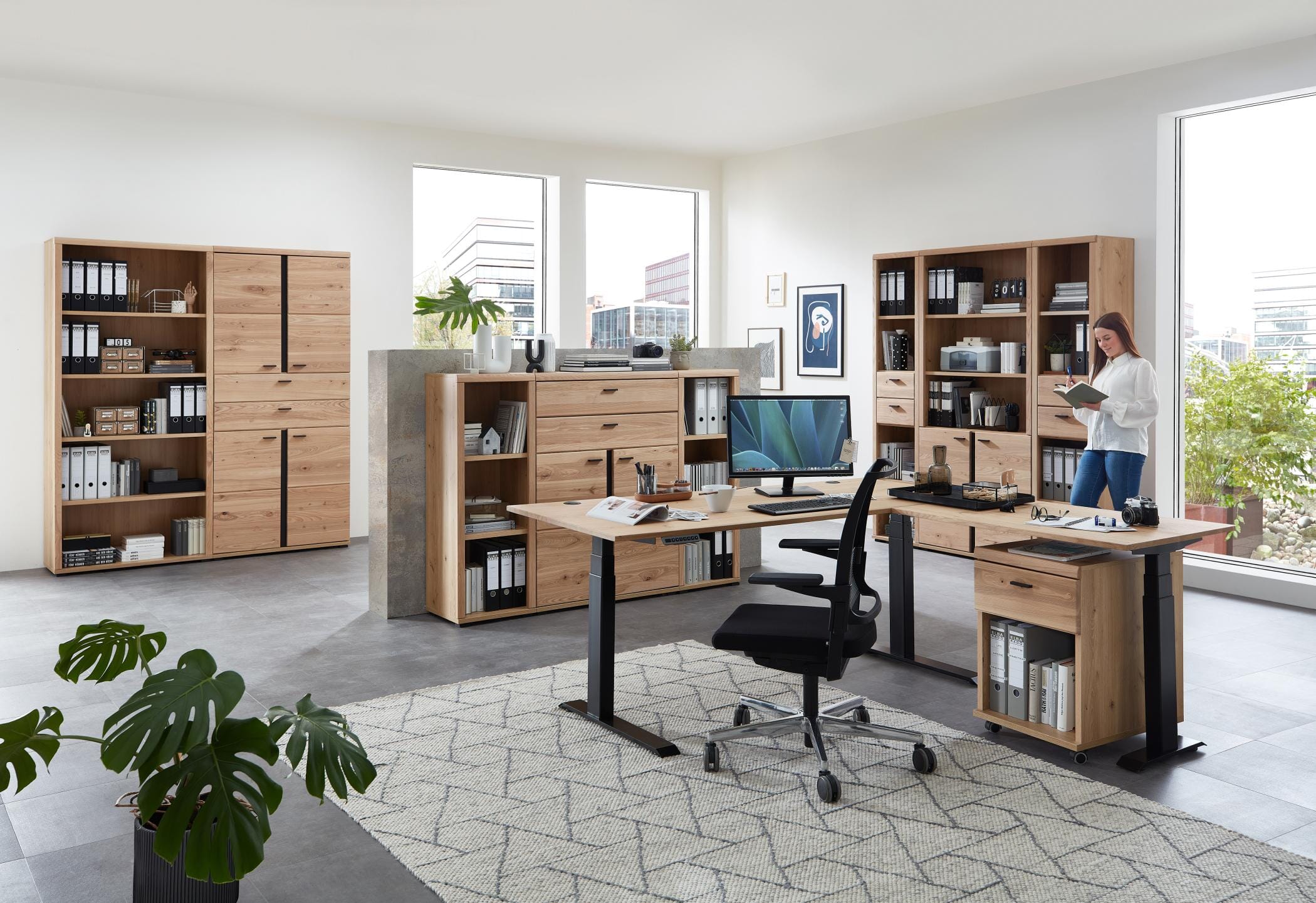 Das Büroregal SONOS mit Massivholzfronten aus gebürsteter Altesche und Korpus in Artisan Eiche Nachbildung ist ein absolutes Highlight für Ihr Büro, die Farbgebung wirkt modern und natürlich zugleich.