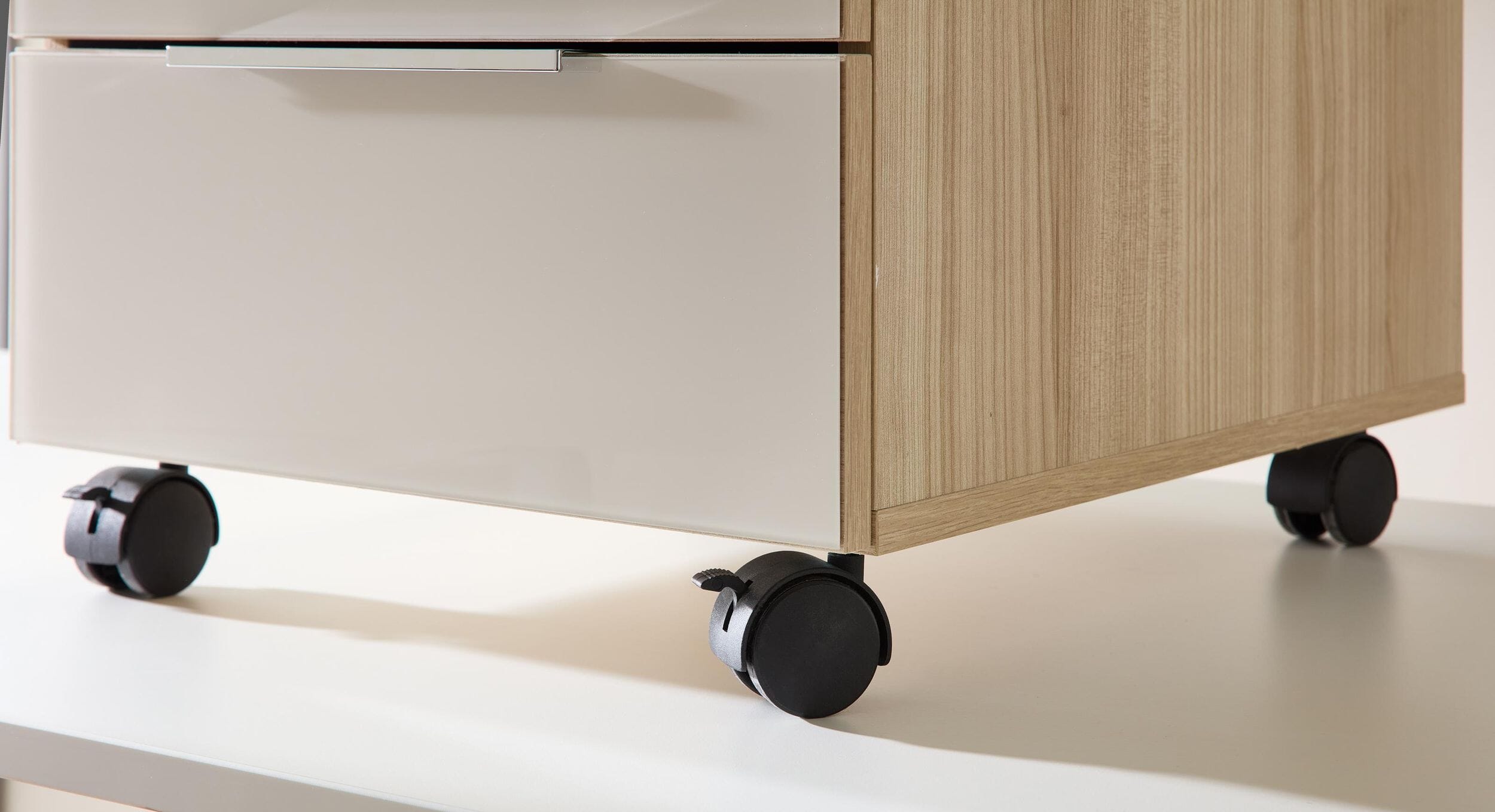 Langlebigkeit trifft auf edle Optik: Die Oberflächen des Containers sind mit einer hochwertigen Melaminharzbeschichtung veredelt, die extrem kratzfest und wasserfest ist. Ein besonderes Highlight sind die Fronten aus rückseitig lackiertem Klarglas, die dem Möbelstück ein brillantes Hochglanz-Finish verleihen. Alle drei Schubkästen sind mit einer modernen Softclose-Funktion inklusive Selbsteinzug ausgestattet, was ein sanftes und nahezu lautloses Schließen garantiert.