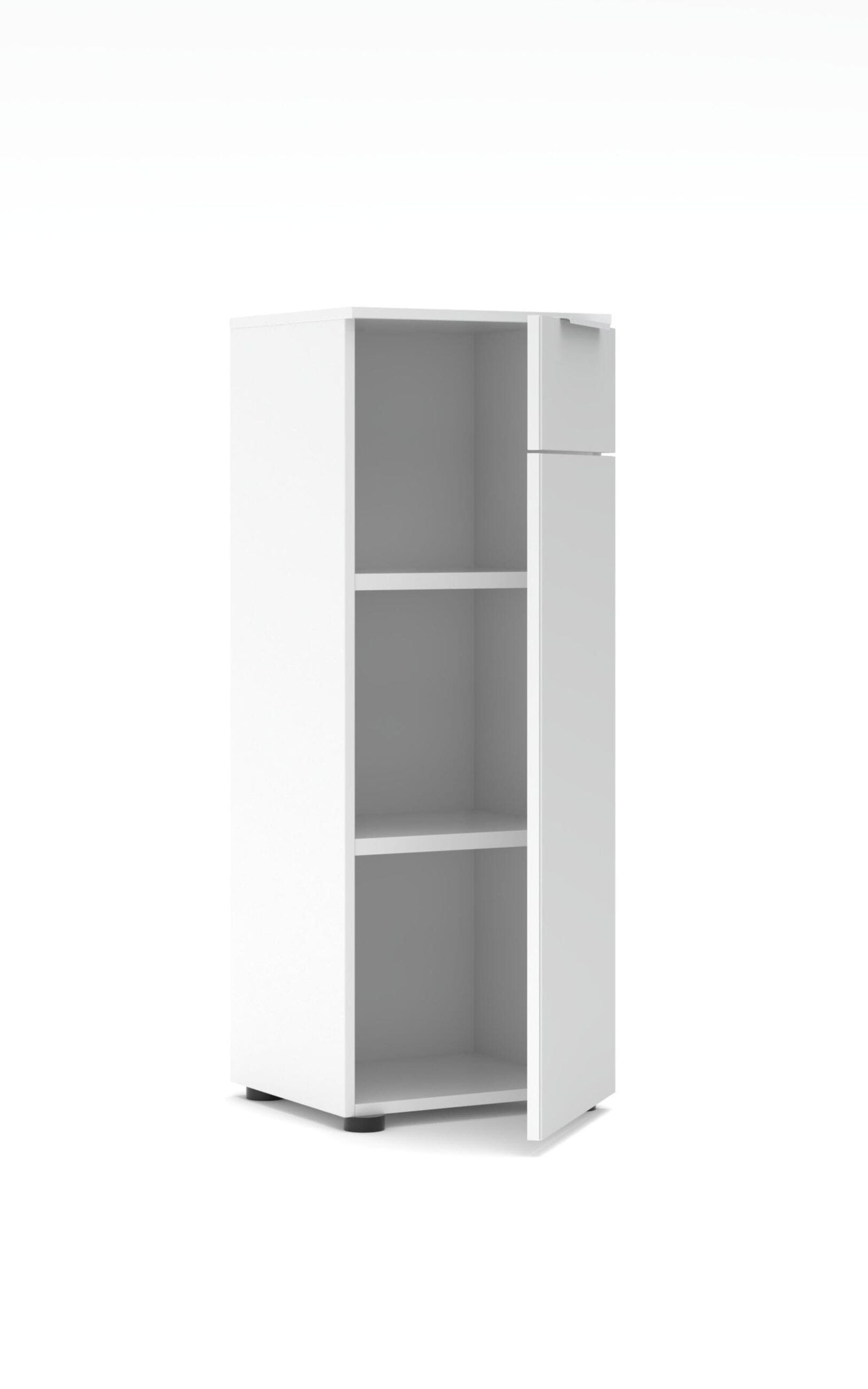 Der kompakte Büroschrank der Serie Santorin ist die ideale Ergänzung für jedes moderne Arbeitszimmer, das Wert auf Stil und Ordnung legt. Mit seiner angenehmen Höhe von 110 cm bietet er wertvollen Stauraum, ohne den Raum optisch zu erdrücken. Die zeitlose Optik in Weiß und die luxuriöse weiße Glasfront erzeugen ein harmonisches Gesamtbild, das Professionalität und eine helle Atmosphäre perfekt vereint.