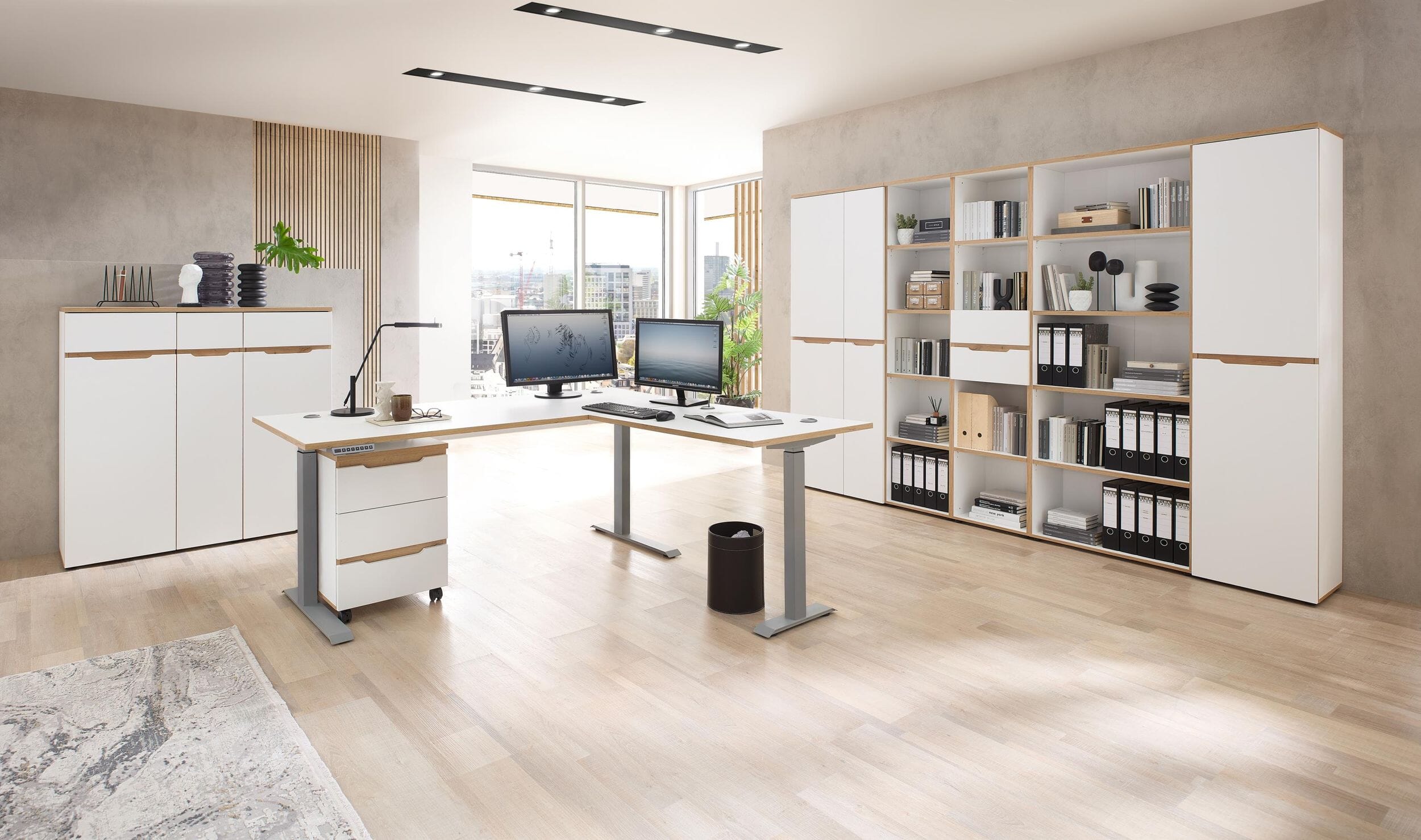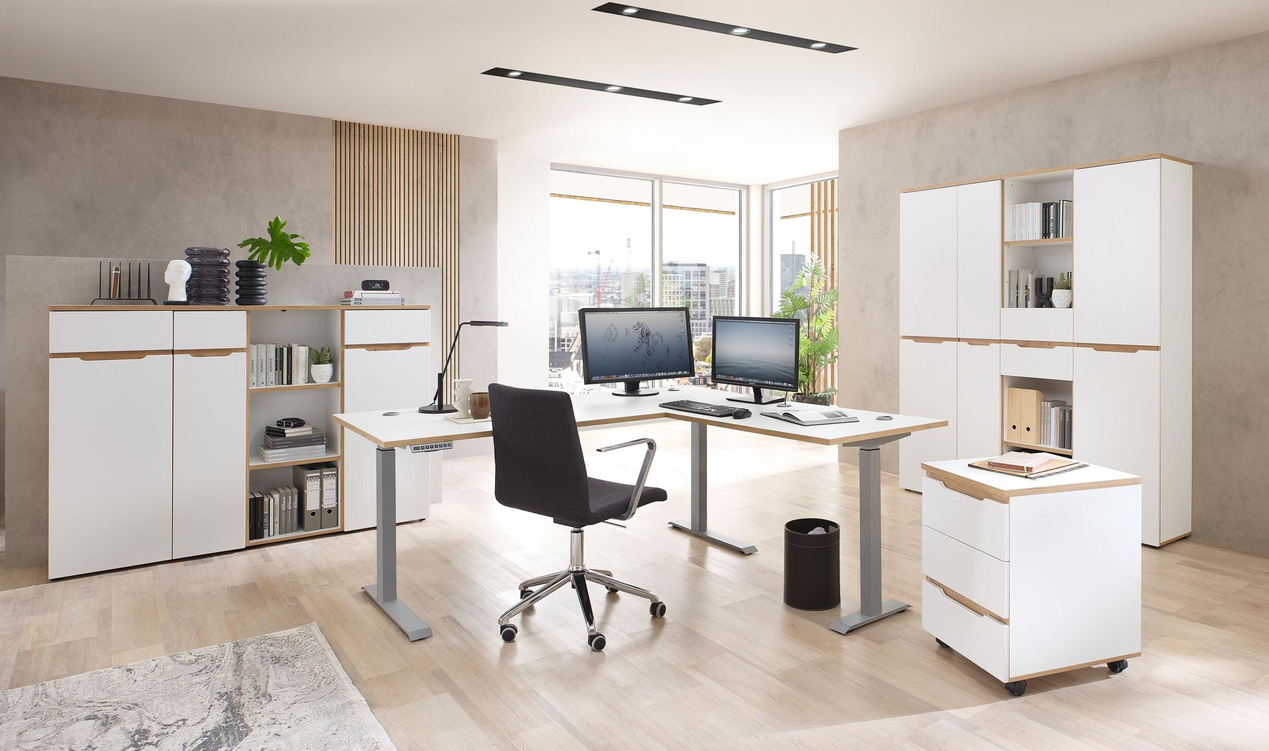 Moderner höhenverstellbarer Winkel-Bürotisch Computertisch mit großer Arbeitsfläche und inklusive Kabelmanagement. HELL & FREUNDLICH - Der Schreibtisch mit stabiler Tischplatte in Weiß Melamin und robustem Stahlgestell, silber matt lackiert, passt ideal in jedes modern eingerichtete Büro und Homeoffice. Die feinen Kanten und Absetzungen in Artisan Eiche Nachbildung setzen dabei einen warmen, skandinavischen Akzent.