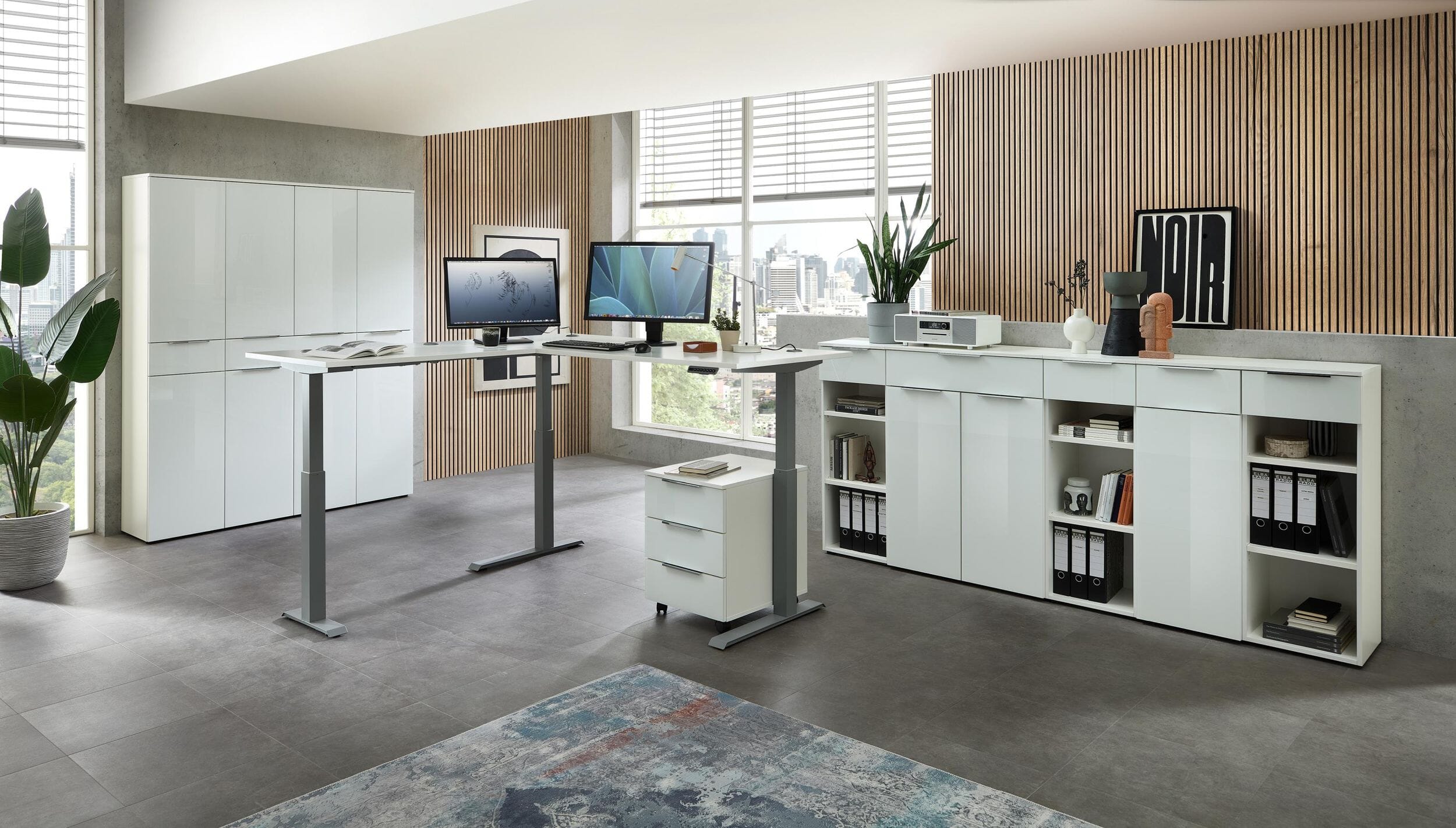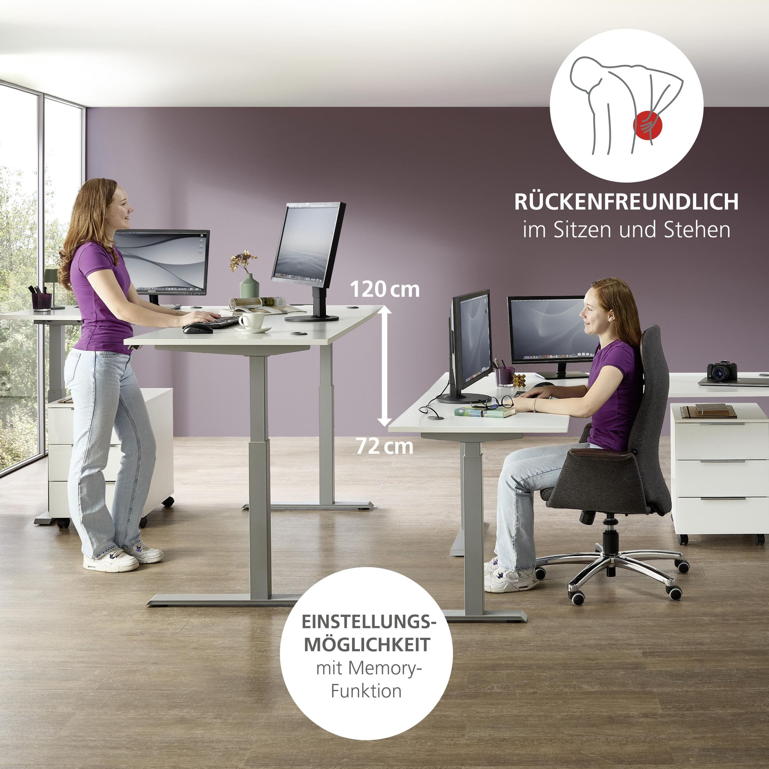 Ein besonderes technisches Highlight ist das leistungsstarke System mit zwei Motoren, das eine besonders sanfte und leise Höhenverstellung ermöglicht. Dank der integrierten Memory-Funktion mit digitaler Anzeige und vier Speichertasten können Sie Ihre optimalen Arbeitshöhen für das Sitzen und Stehen einfach per Knopfdruck abrufen.