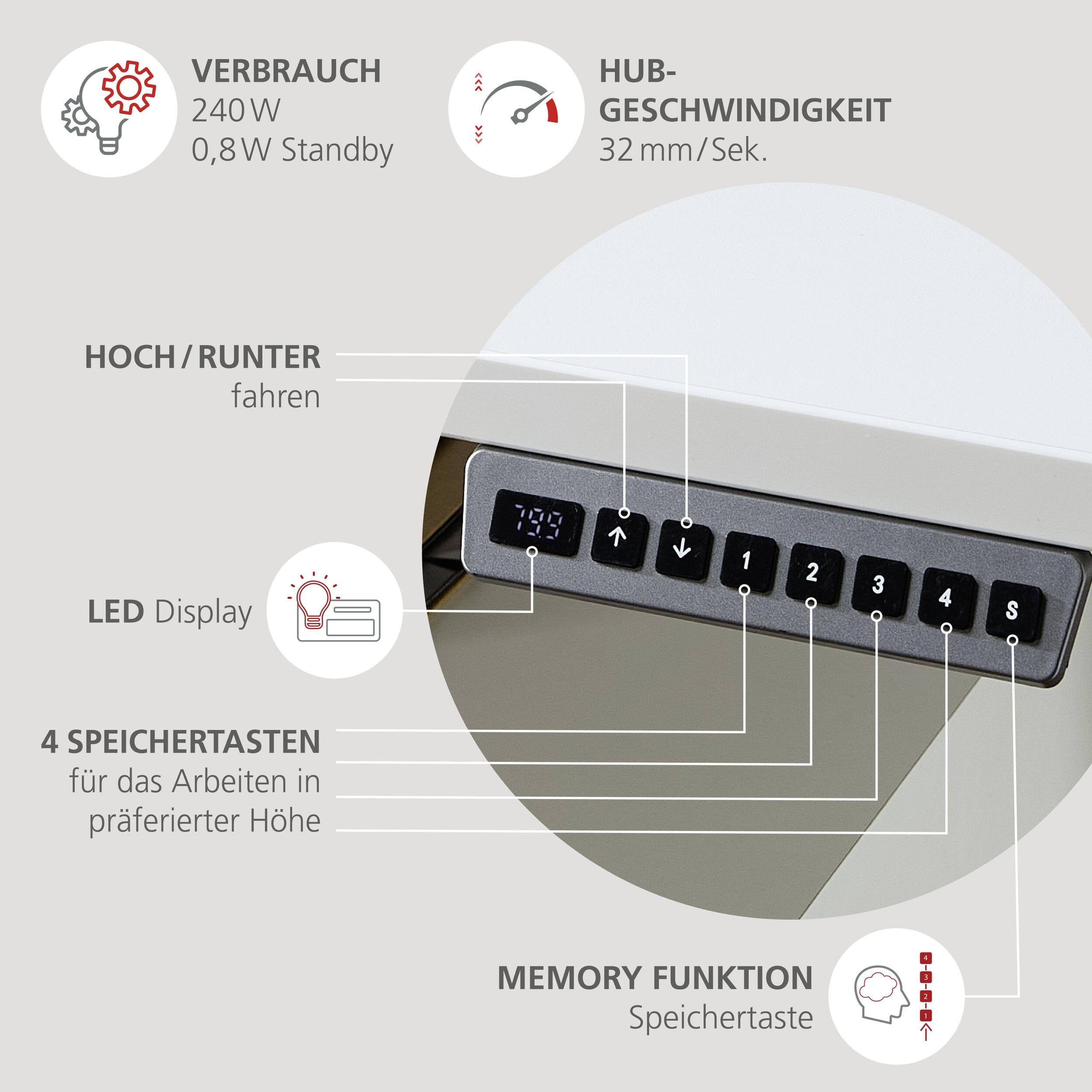- Smart-Bedienung: Memory-Funktion mit 4 Speicherslots und digitaler Höhenanzeige (links oder rechts montierbar)
